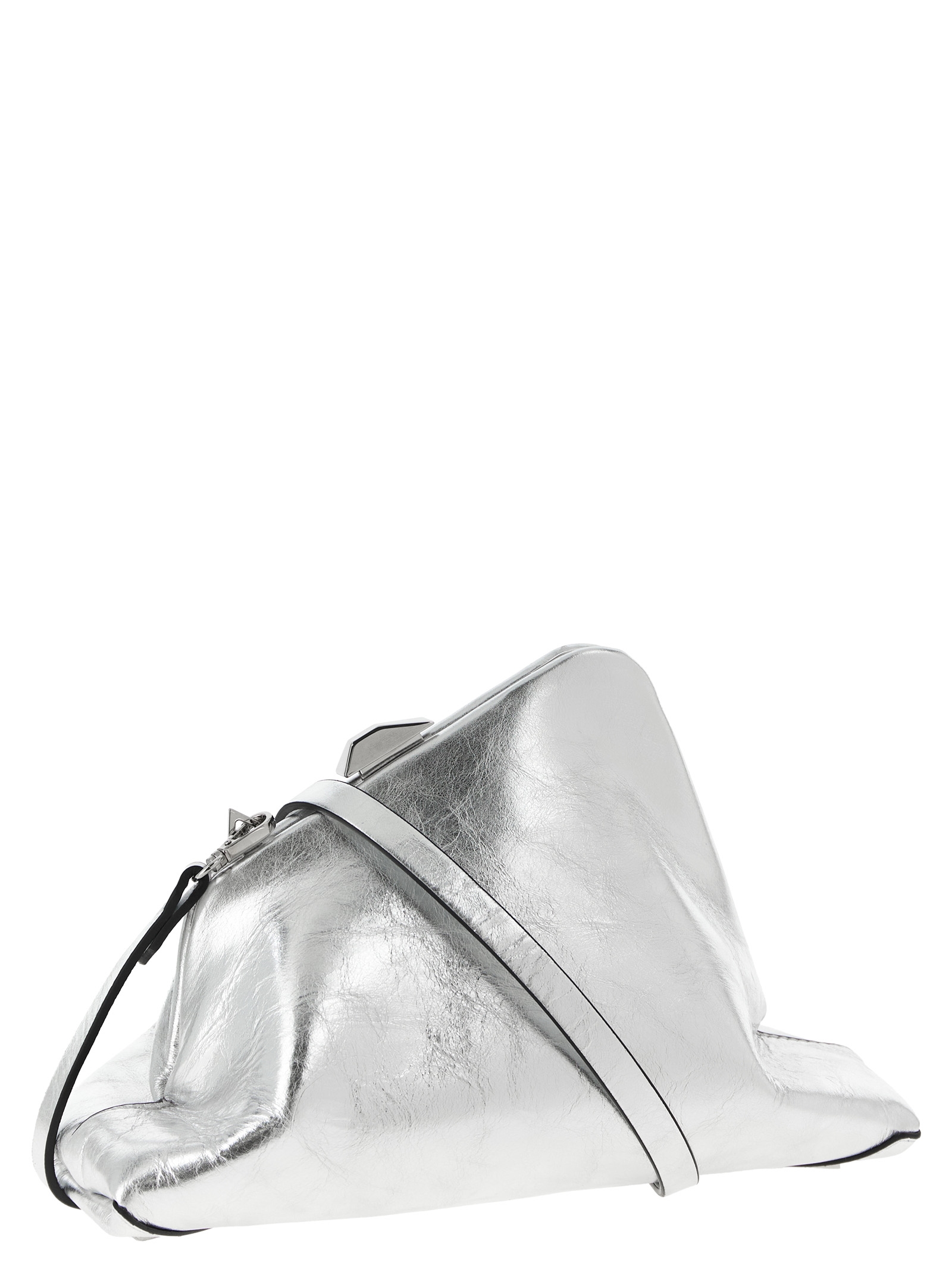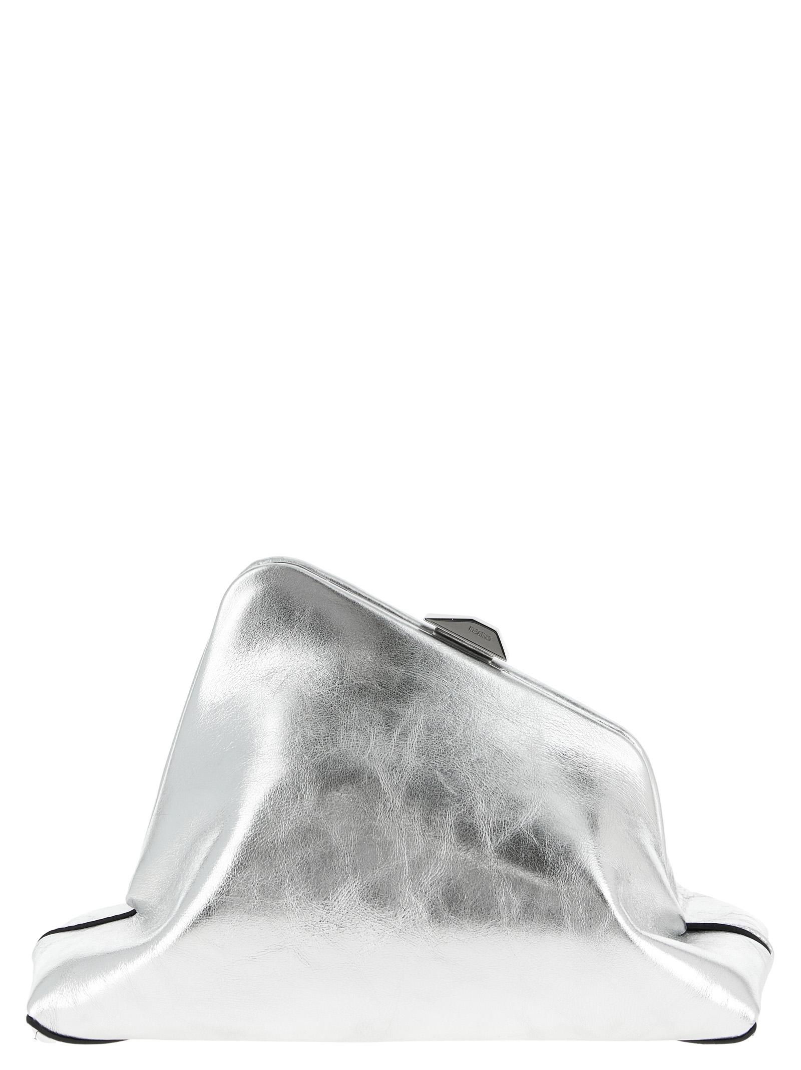 ‘Day Off Small’ craquelé laminated leather clutch with snap closure, rigid base with metal logo feet, adjustable and removable leather shoulder strap.
