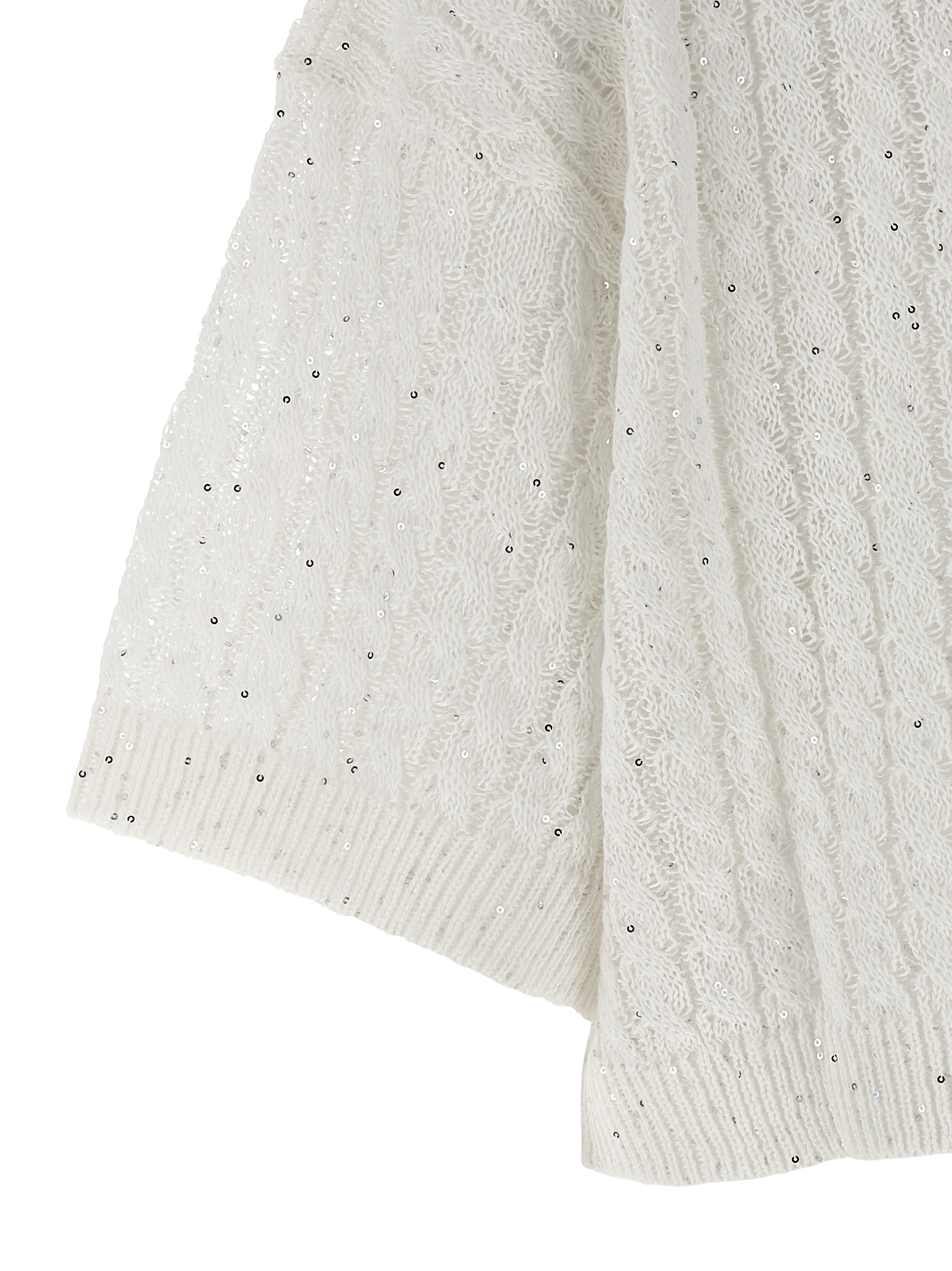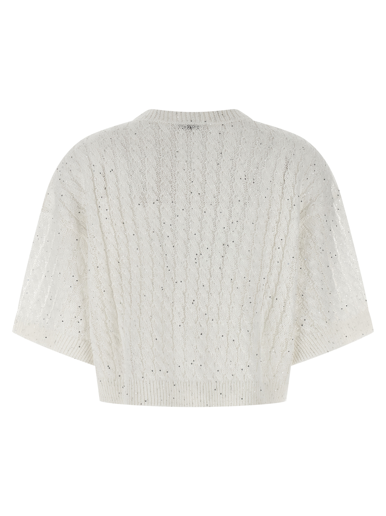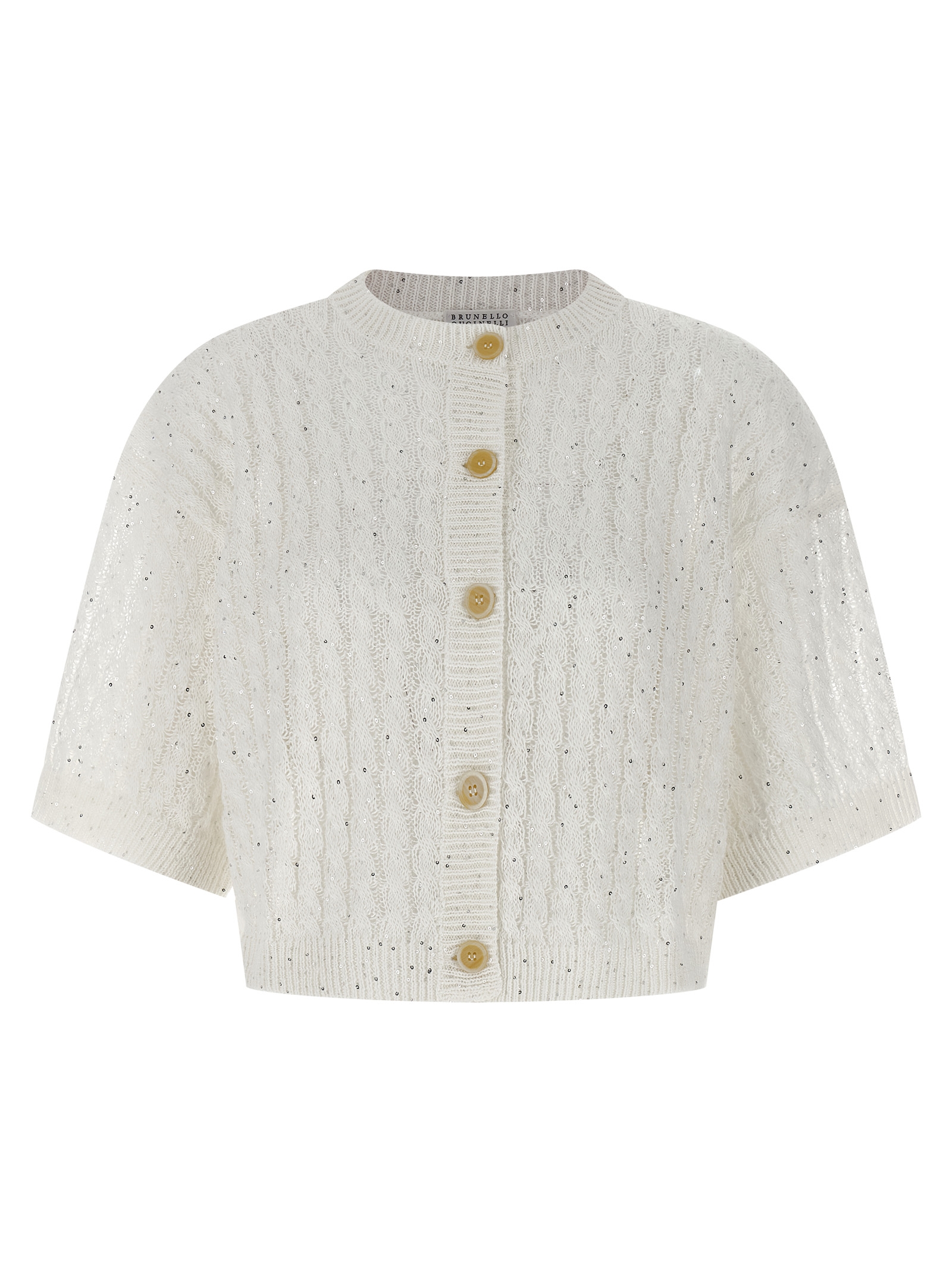 ‘Dazzling Cable’ openwork ribbed linen cardigan with braided pattern and all-over sequin application, crop model, crew neck, short sleeves with cuffs and dropped shoulder.