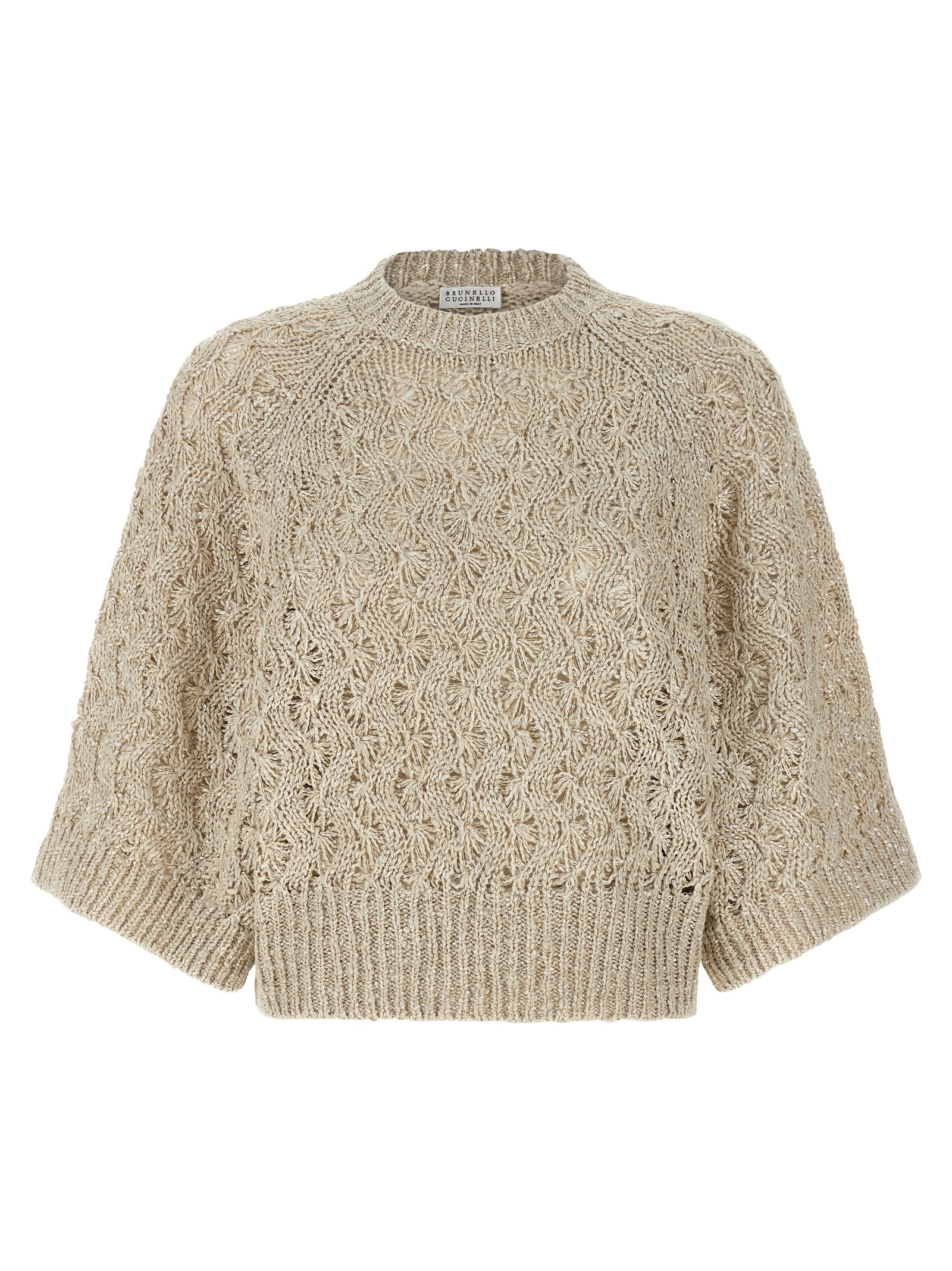 ‘Dazzling’ sweater in silk and linen blend knitted with all-over sequin application, crop model, crew neck, short sleeves with cuffs and dropped shoulder.