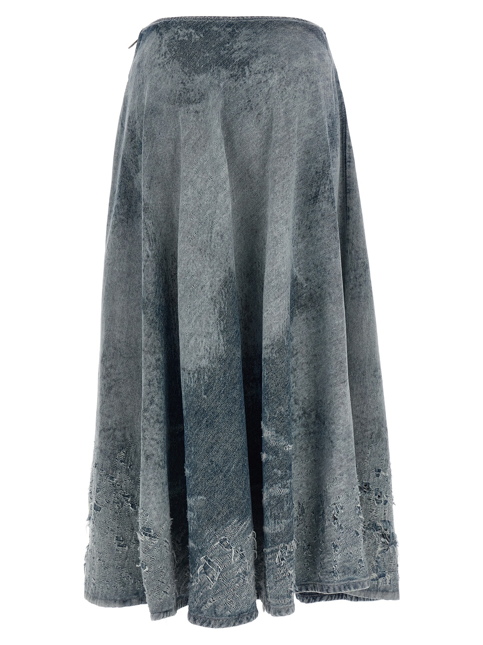 De-Annet-Fsh’ long jacquard skirt in cotton denim with abrasions, mist bleach effects and floating threads, front metal cut-out logo, wheel model, side zip closure, unlined.