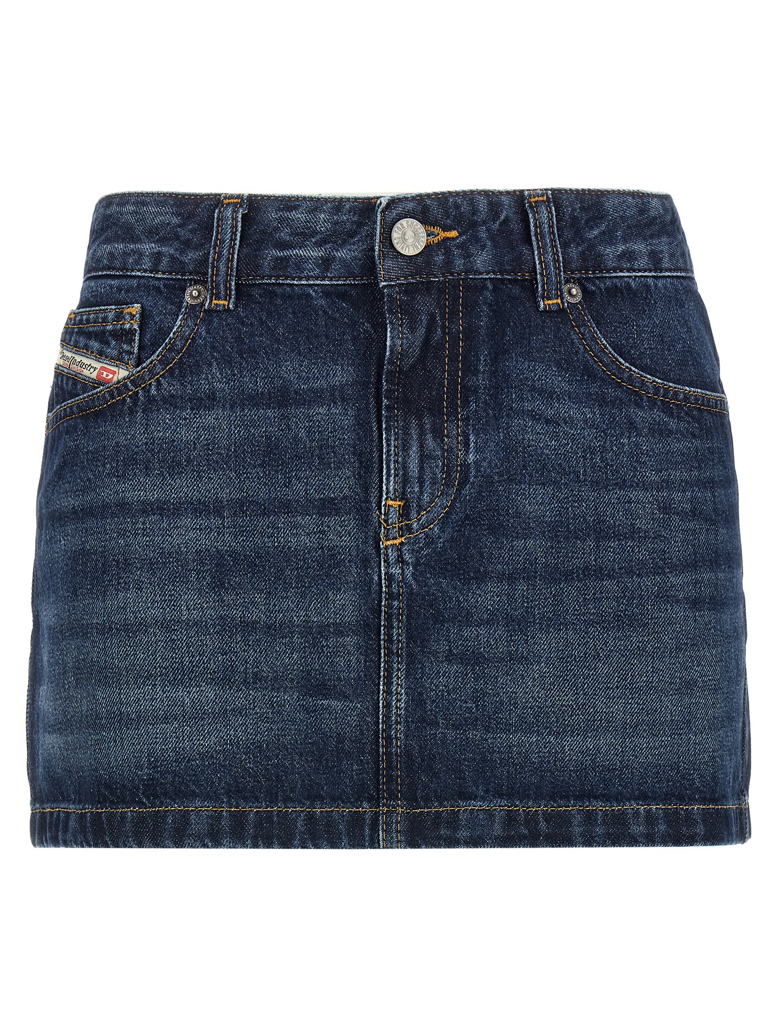 ‘De-Ron’ low-waisted mini skirt in cotton denim with front zip and button closure, five pockets, back logo tag.