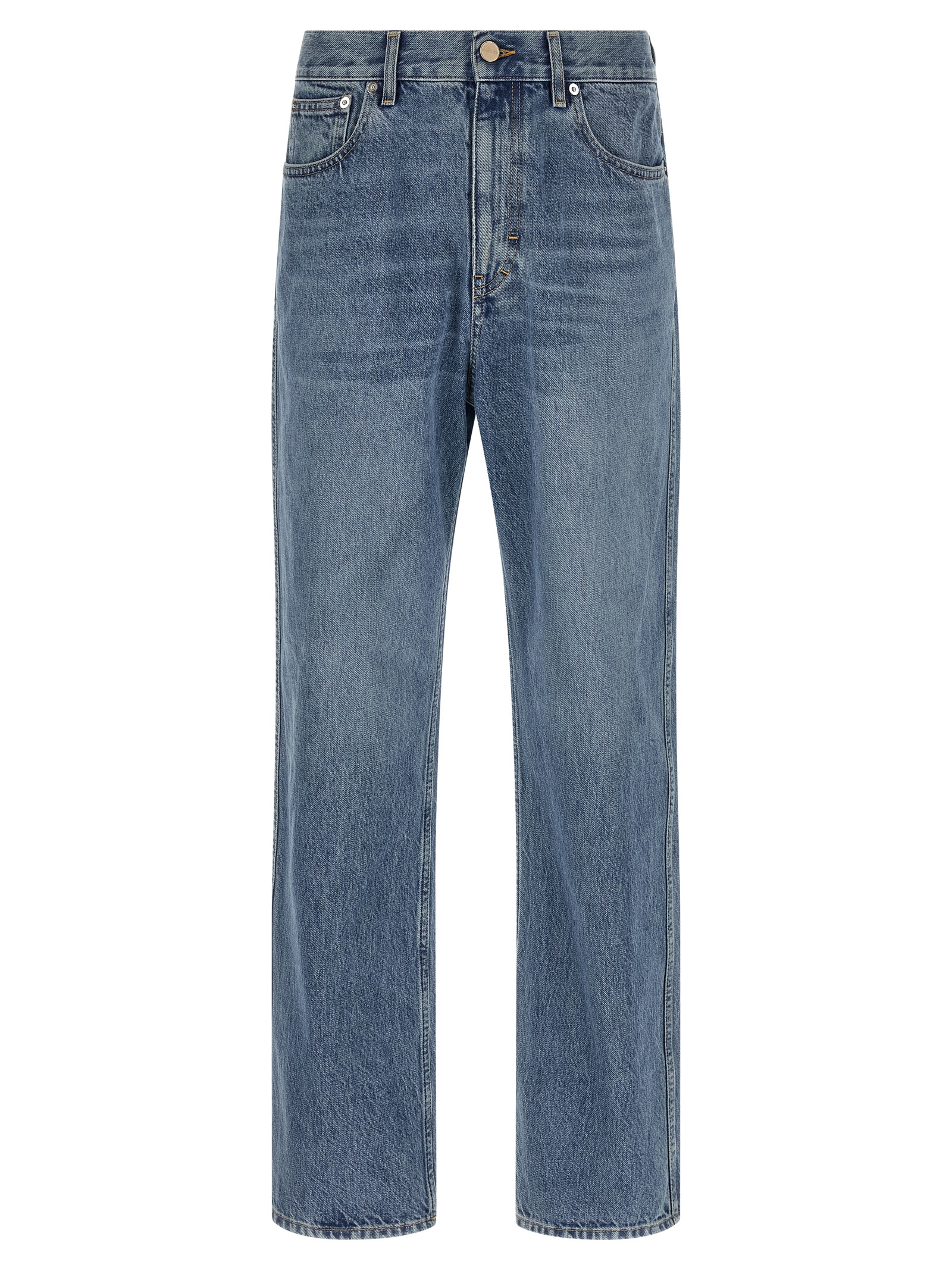 Délavé effect cotton denim jeans, straight leg, contrast stitching, zip and front button closure, five pockets, ‘Gucci Rosso Ancora’ naplak logo tag.