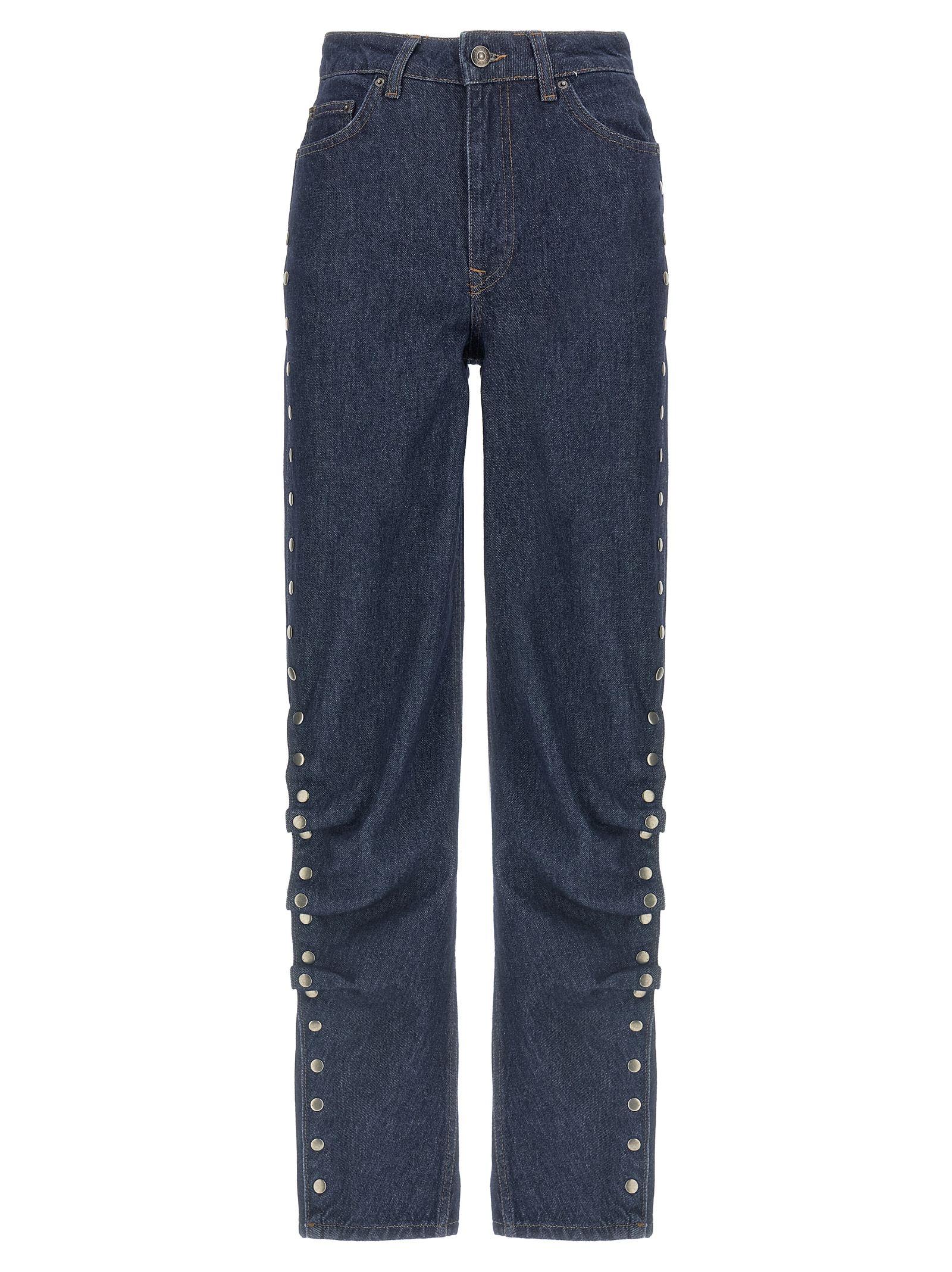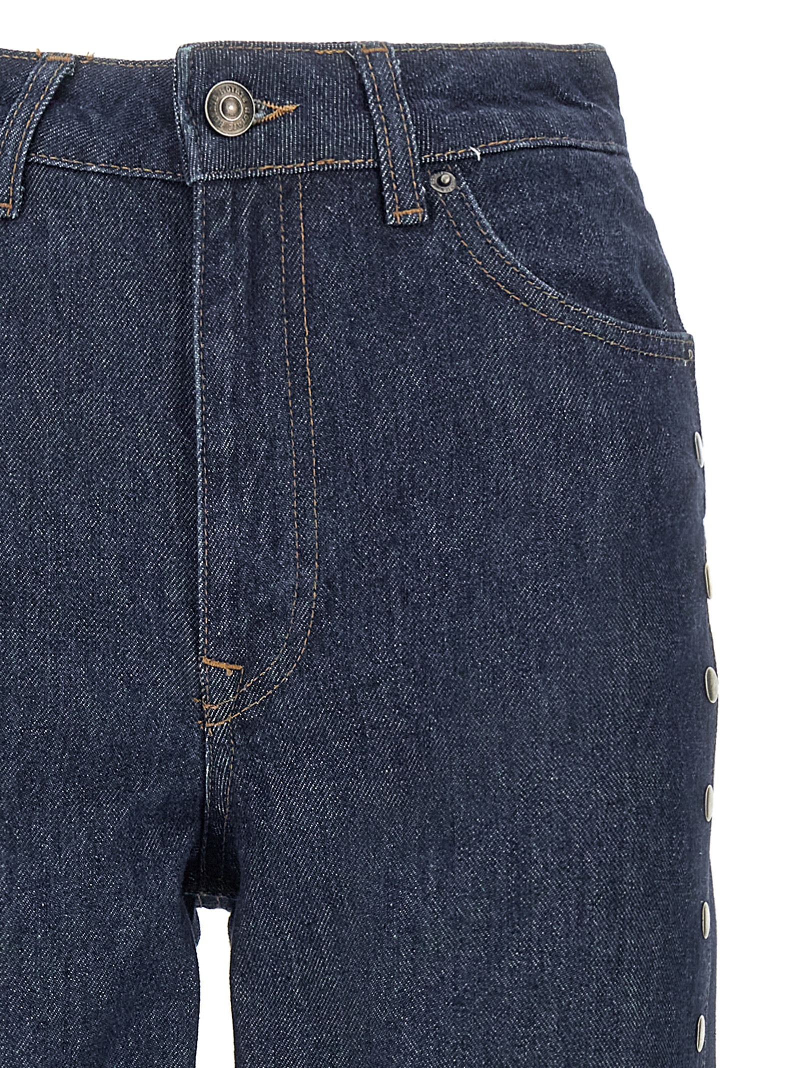 ‘Denim Buttoned’ cotton denim jeans with contrast stitching, wide leg with asymmetrical line of side snap buttons to create curls as desired, zip and front button closure, five pockets, back leather logo tag.