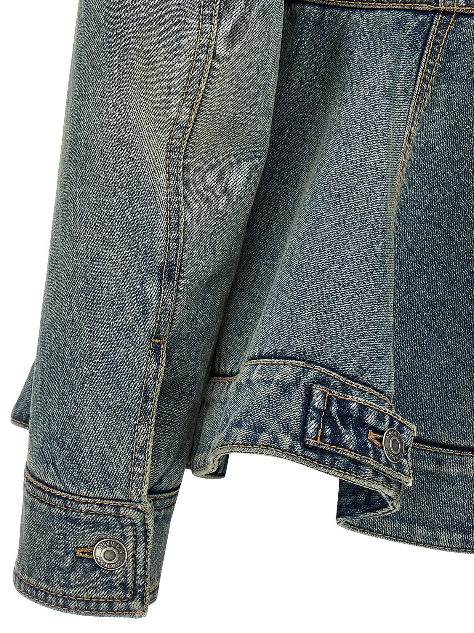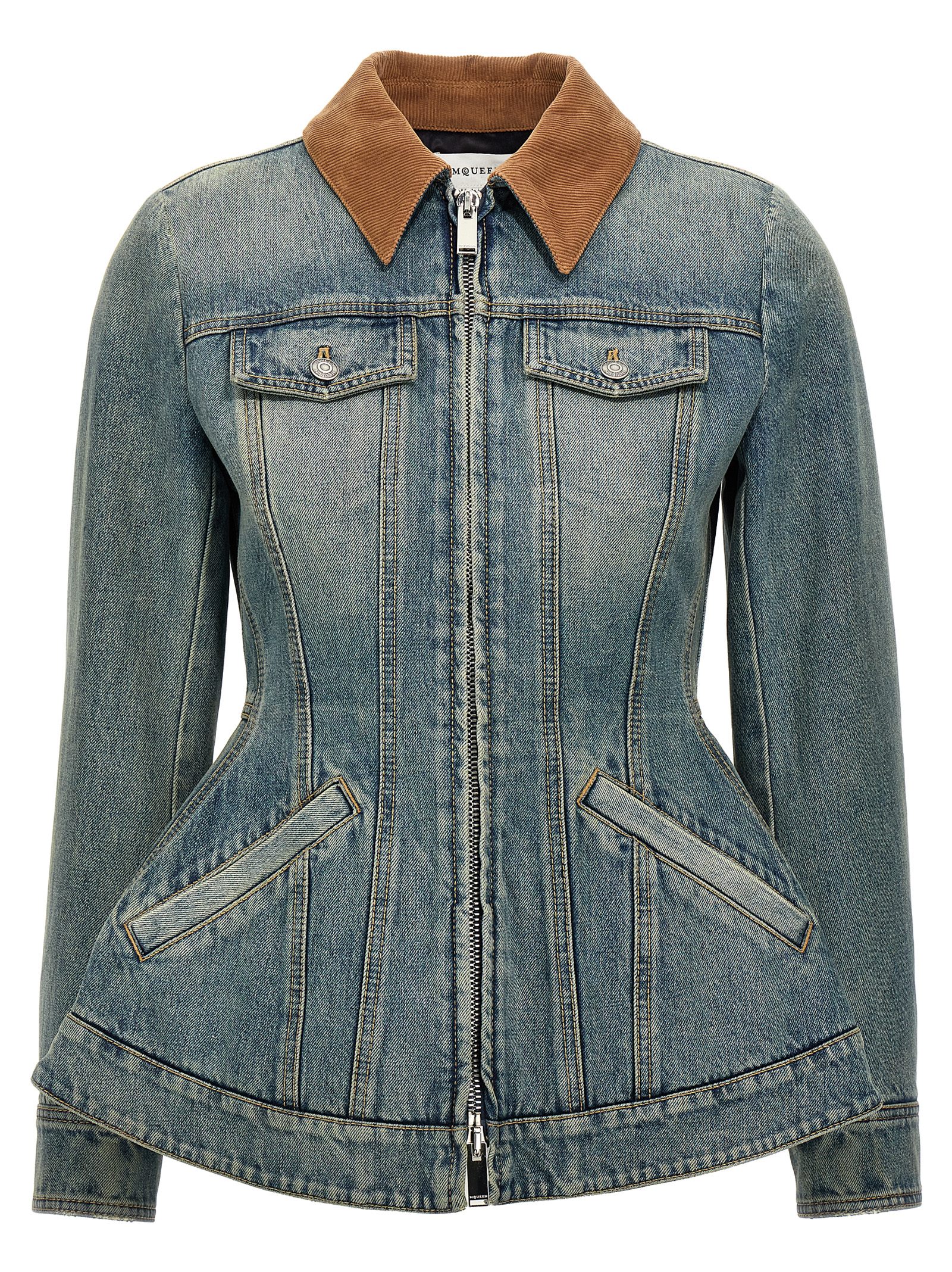 Delavé denim jacket, fitted pattern with flared garment bottom, pockets, corduroy collar, front zipper closure, long sleeve with cuff.