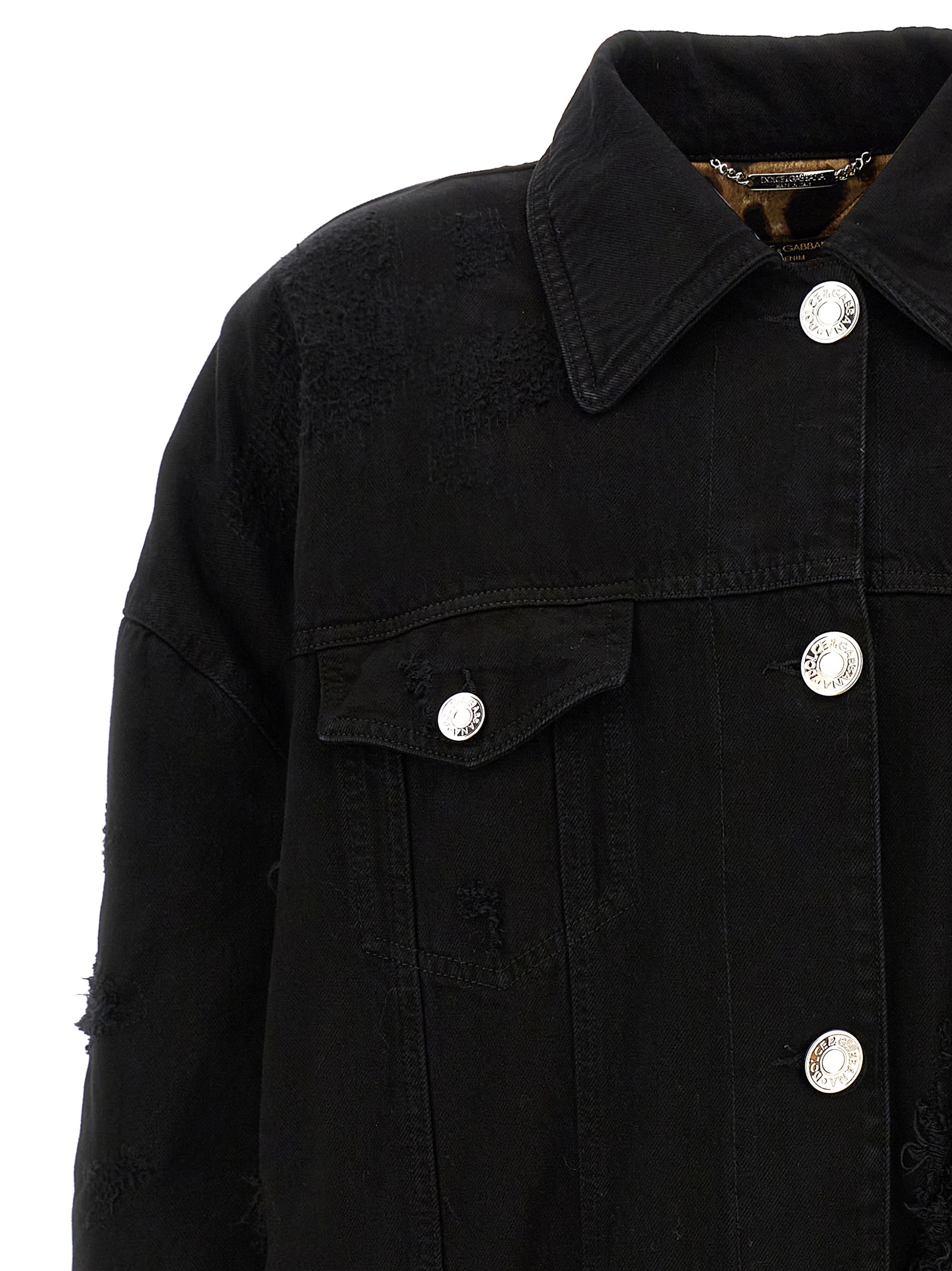 Long jacket in slightly padded used-effect denim lined with leopard-print stretch satin, metal logo plaque on the back, button closure, pockets, long cuffed sleeves.