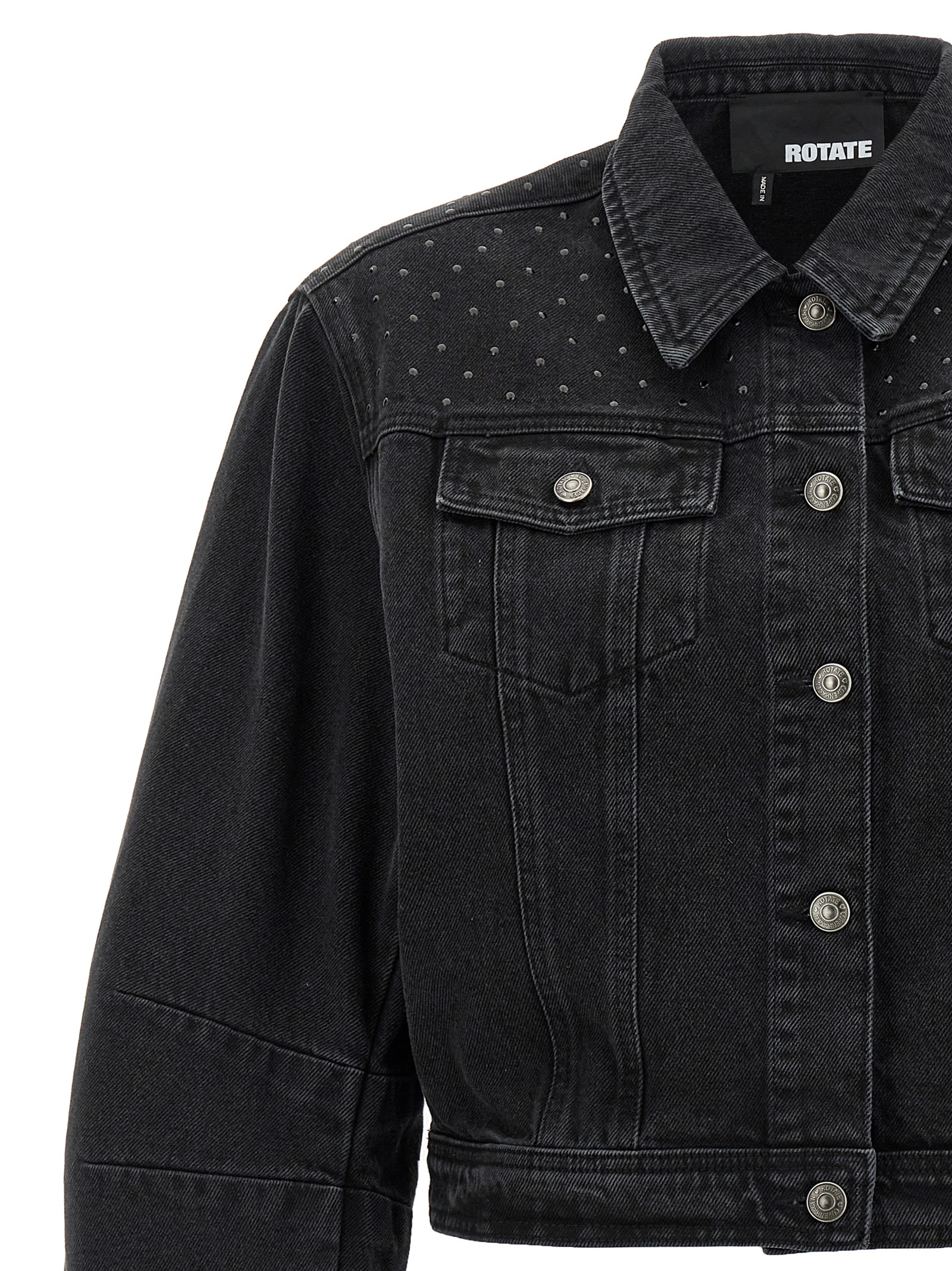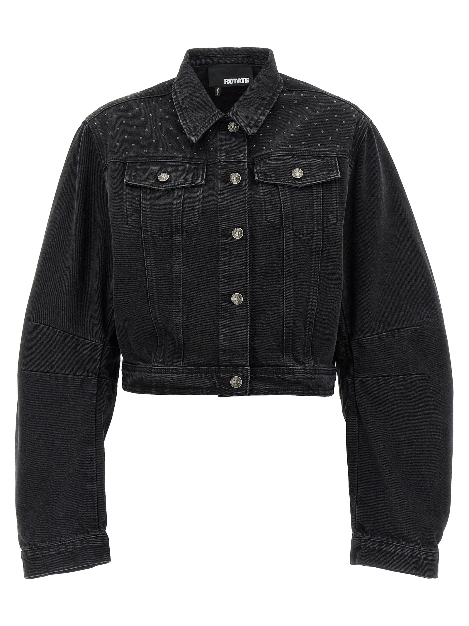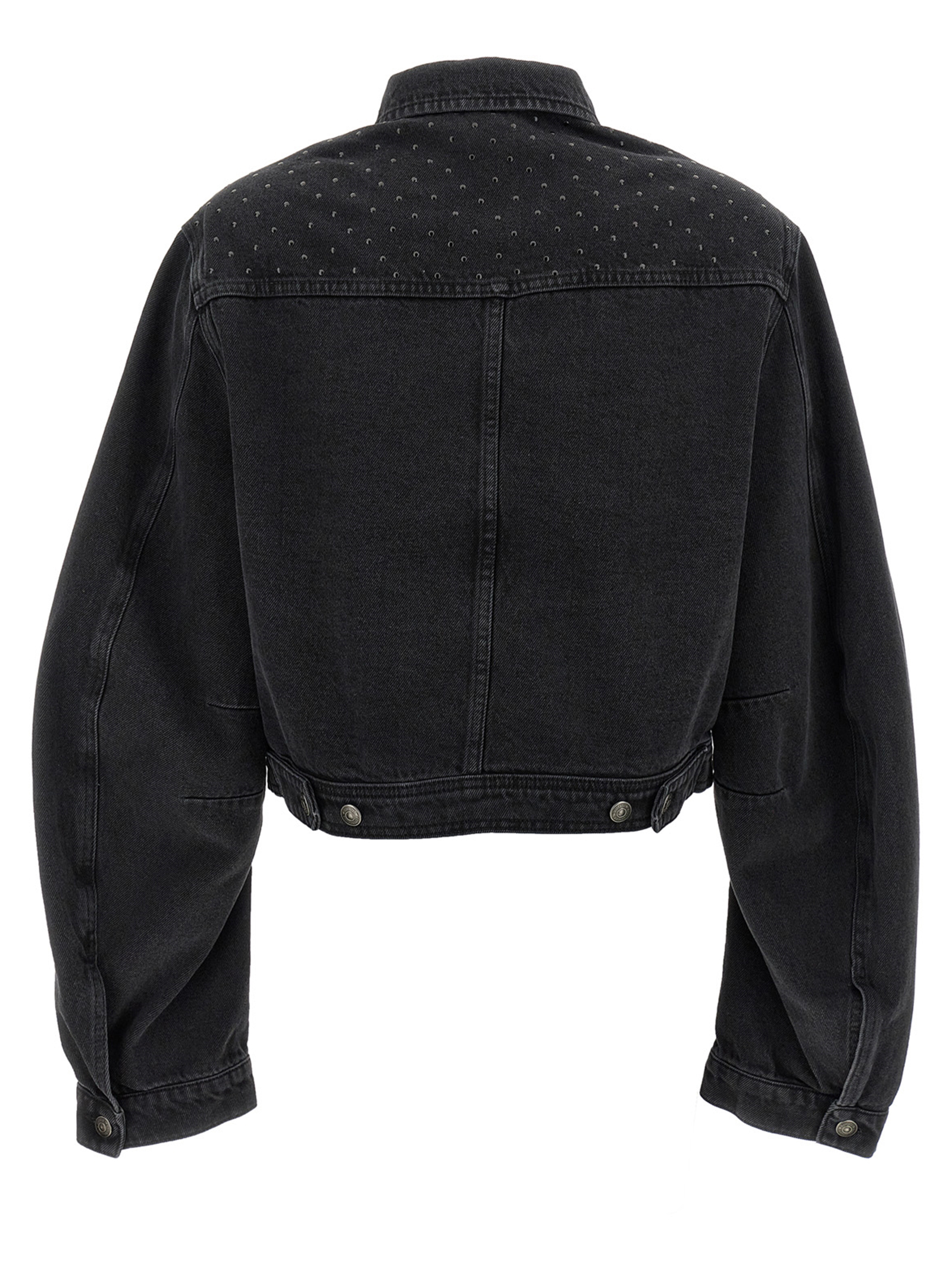 Denim Oversized’ cotton denim jacket with tone-on-tone metal studs, crop style, front button closure, pockets, long cuffed sleeves and dropped shoulders.