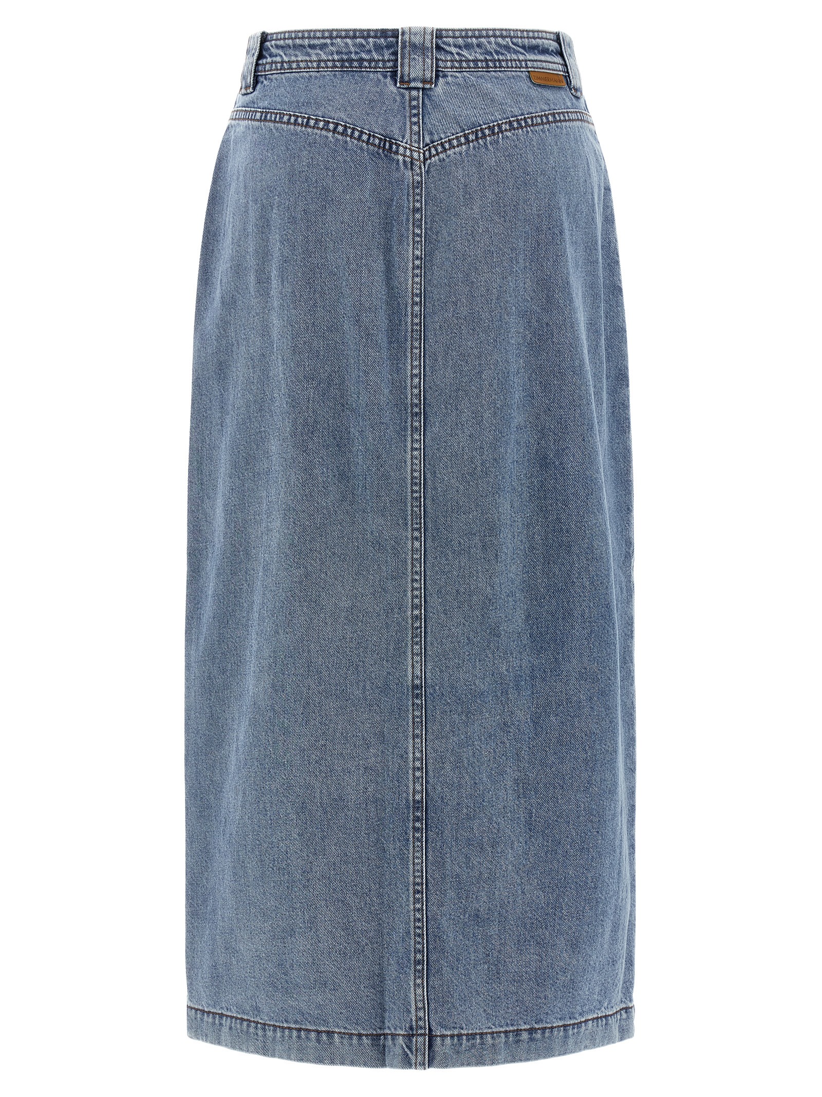 Denim Pencil cotton midi skirt with front metal button closure, front pockets, belt loops at the waist.