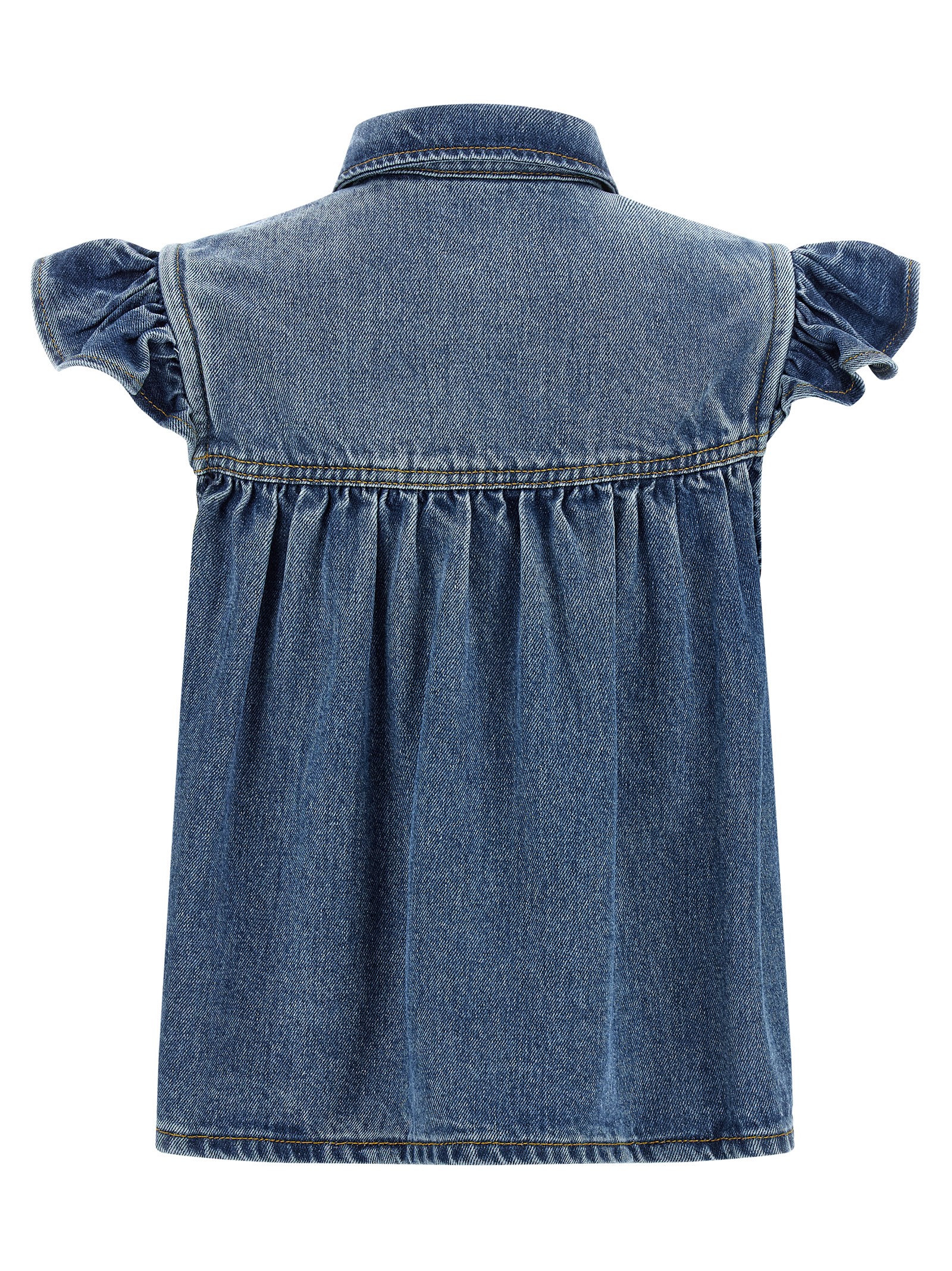 Denim Ruffle top in denim-effect TENCEL™ Lyocell fabric with contrast stitching, shirt collar, front metal button closure, ruffled sleeves.