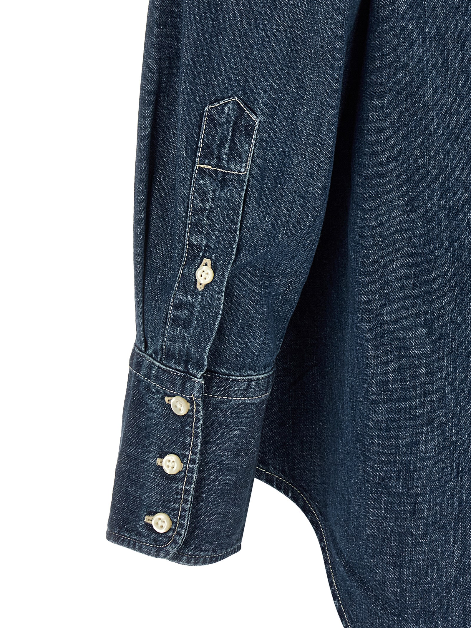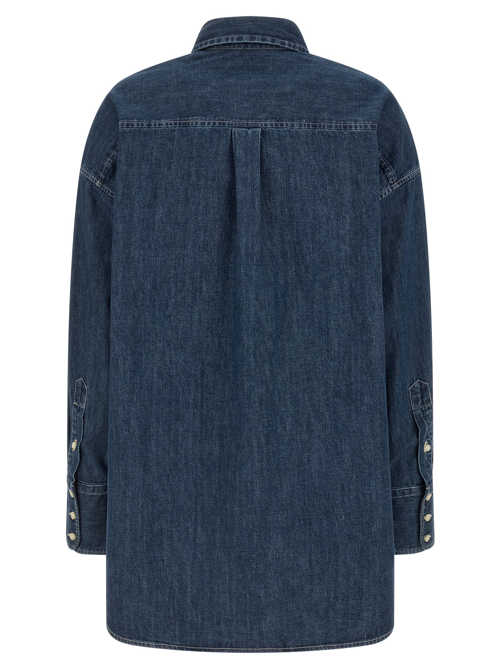 Cotton denim shirt with contrast stitching, trapeze silhouette, trompe l’oeil plastron and front button closure, long sleeves with dropped shoulders, logo embroidered cuffs, asymmetrical rounded hem.