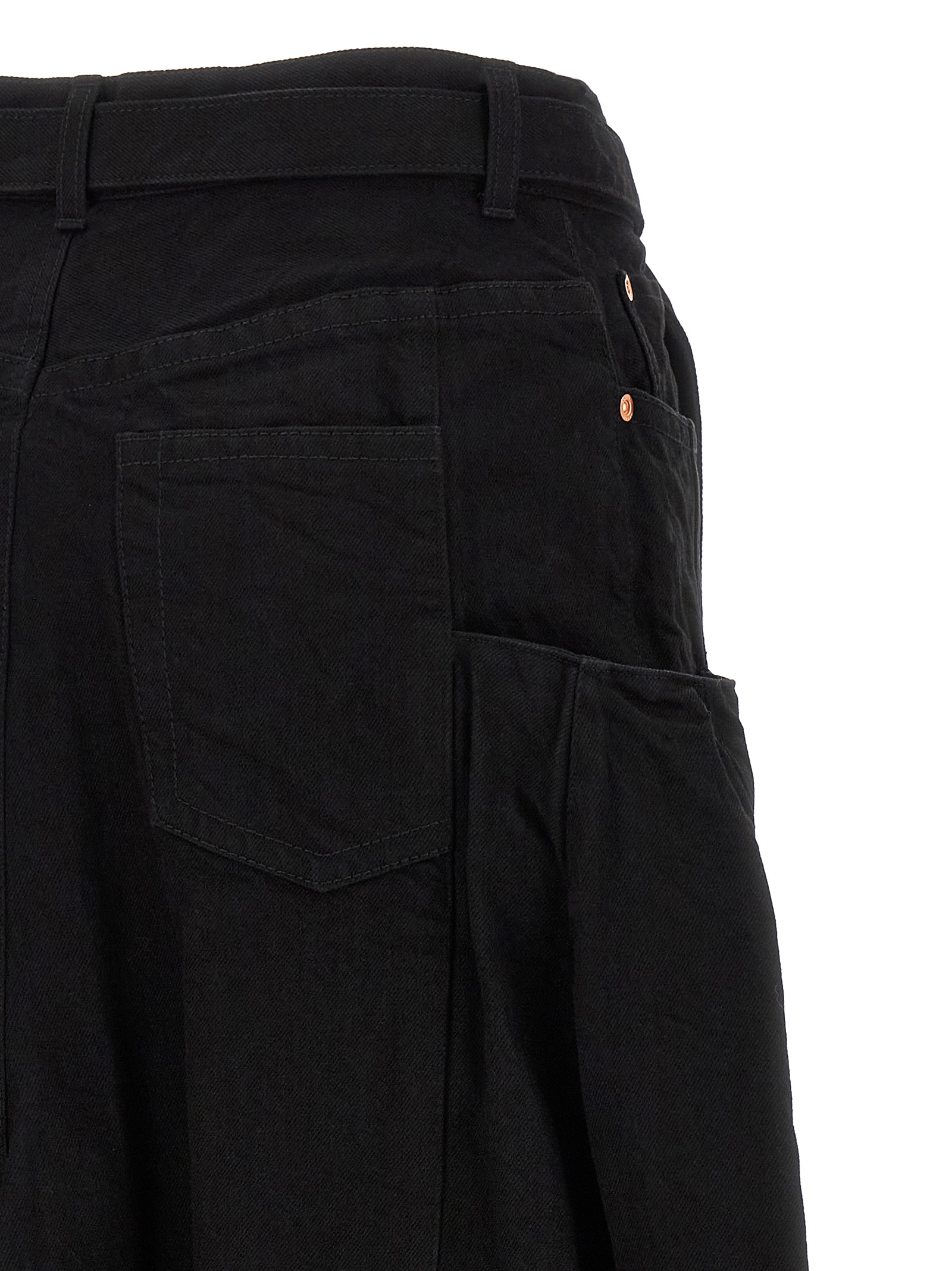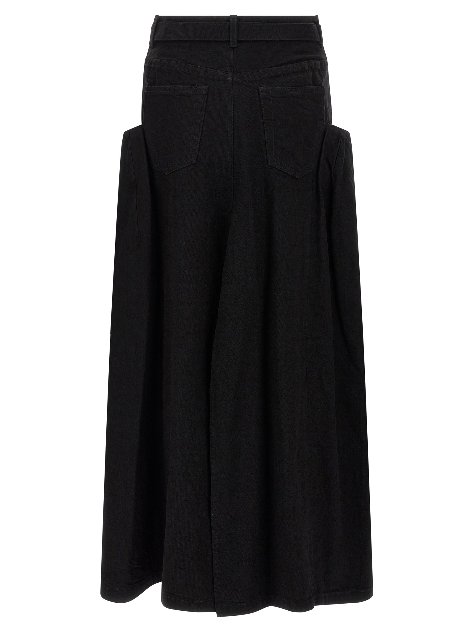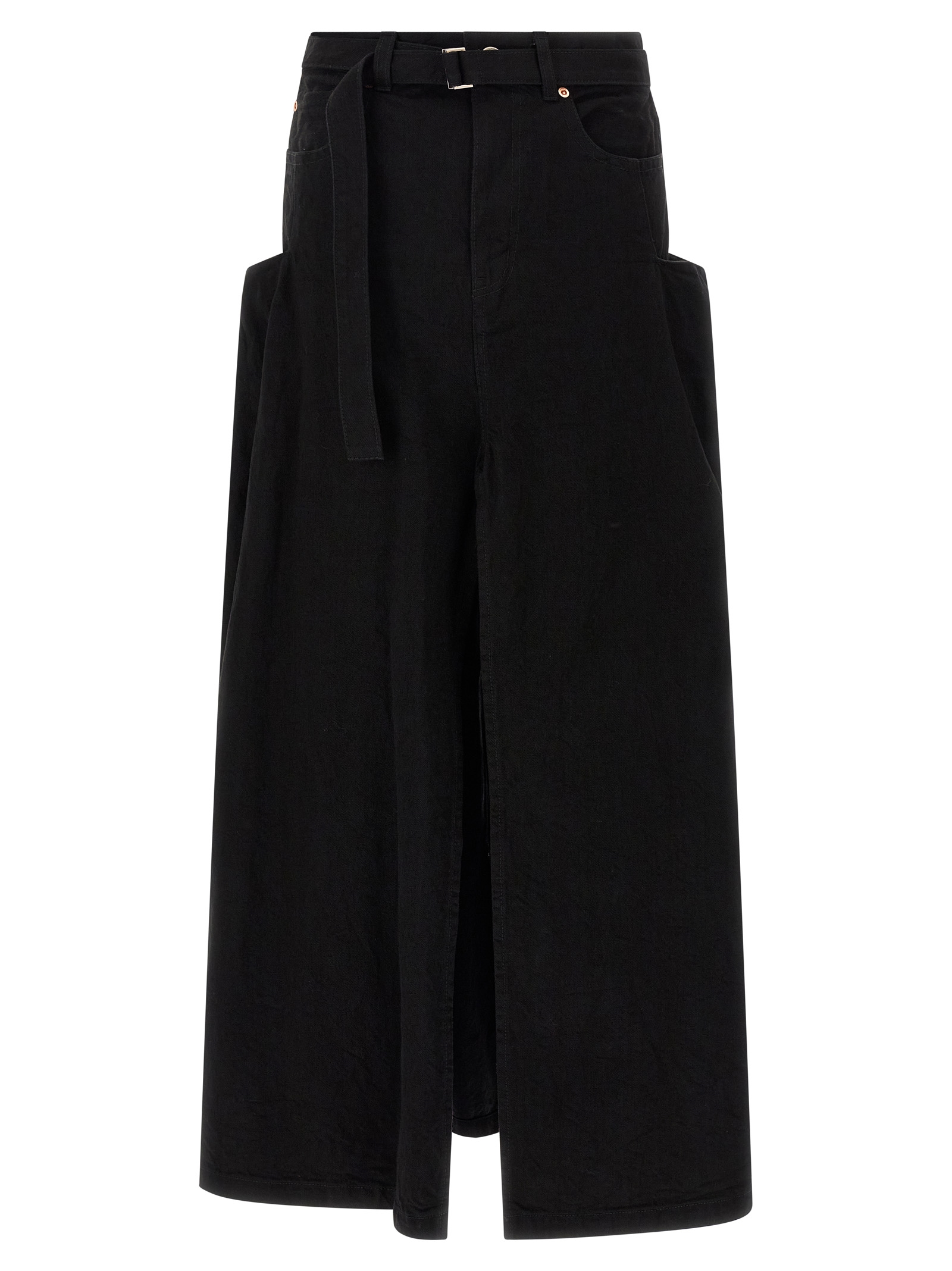 Long skirt in garment-dyed cotton denim with trompe l’oeil trouser construction, front zip and button closure, pockets, wide front and back split, and removable belt.