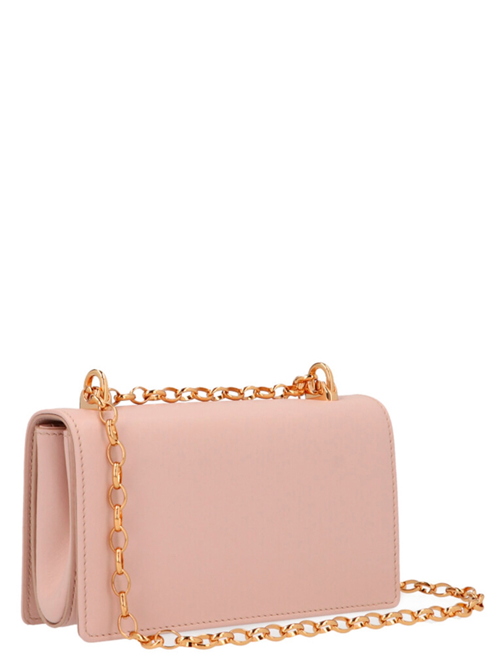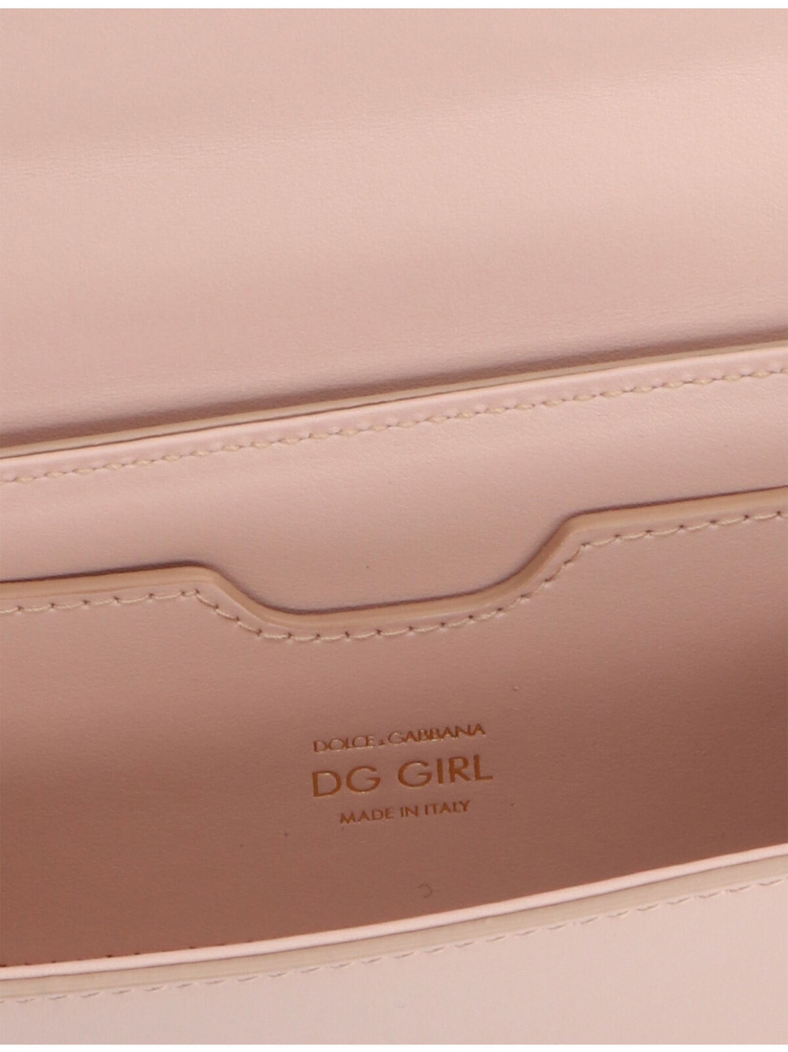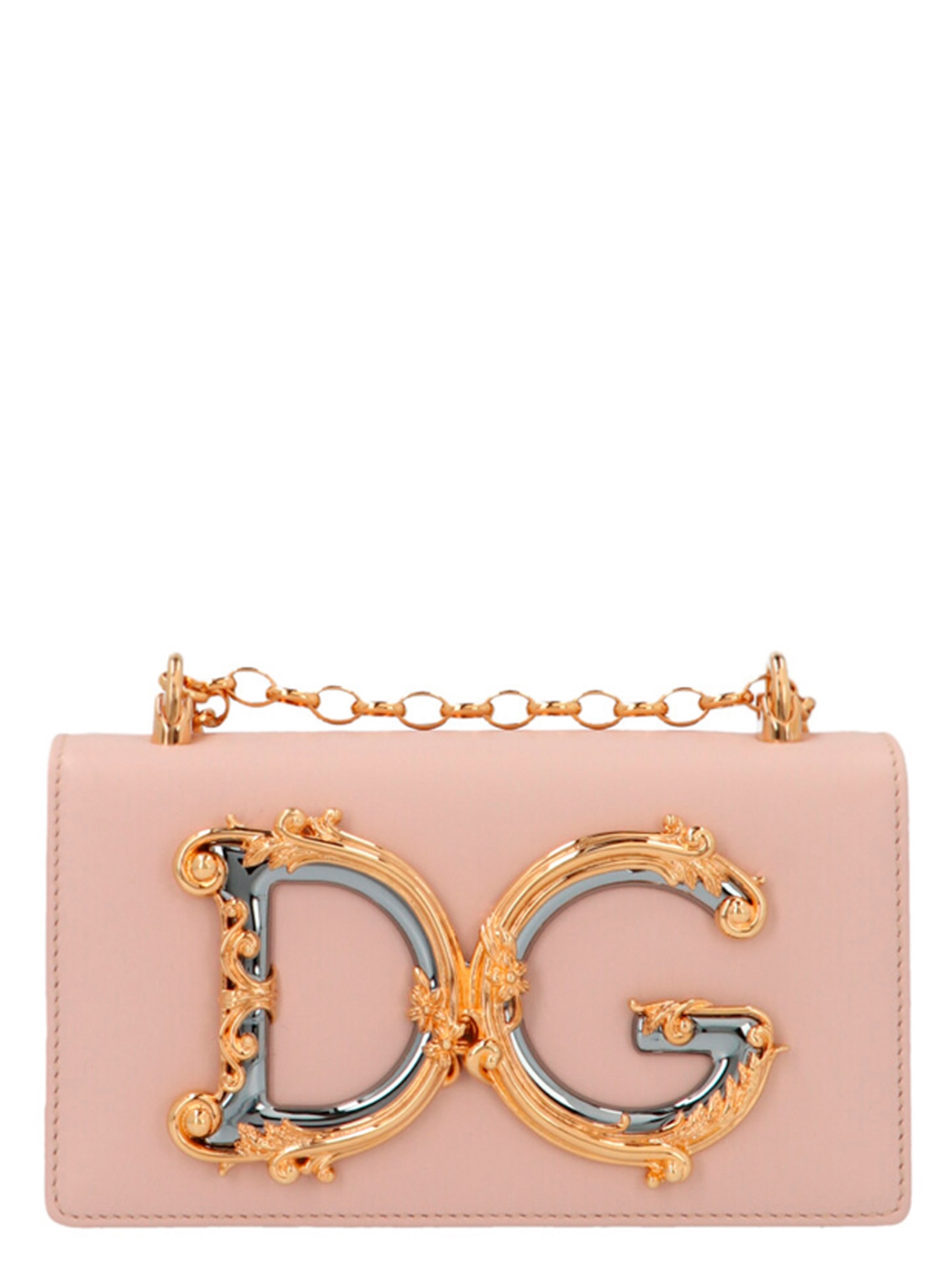 ‘DG Girl’ mini calf leather crossbody bag with gold logo and hardware, flap closure and chain shoulder strap.