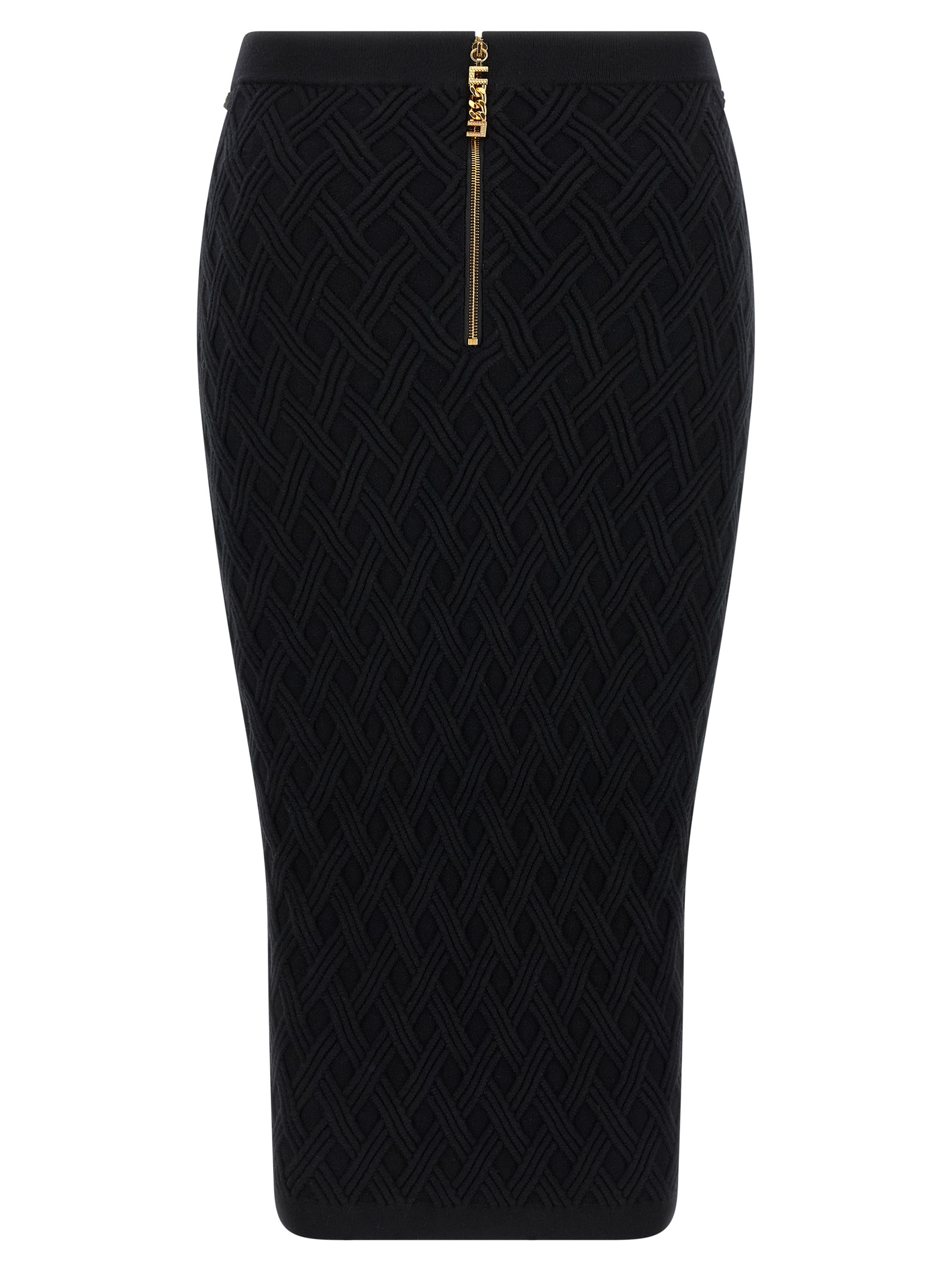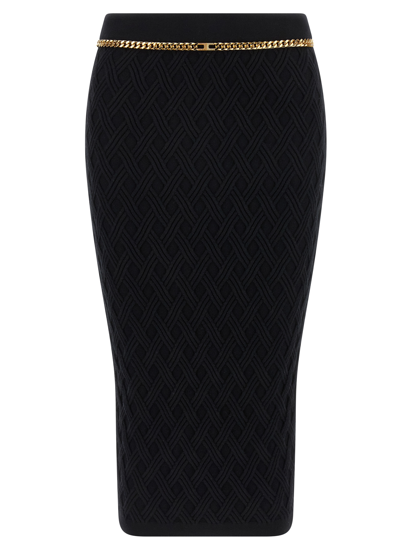 Viscose knit midi skirt with 3D diamond pattern, tube design, high waist with diamond chain detail with logo and rhinestones on the front, back zip closure.
