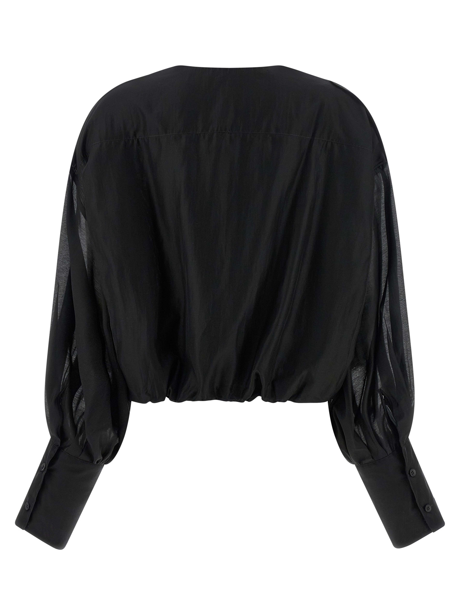 ‘Diana’ blouse in light muslin, crew neck, concealed front button closure, wide puff sleeves with cuffs and dropped shoulder, shoulder trim, and curling on the hem.
