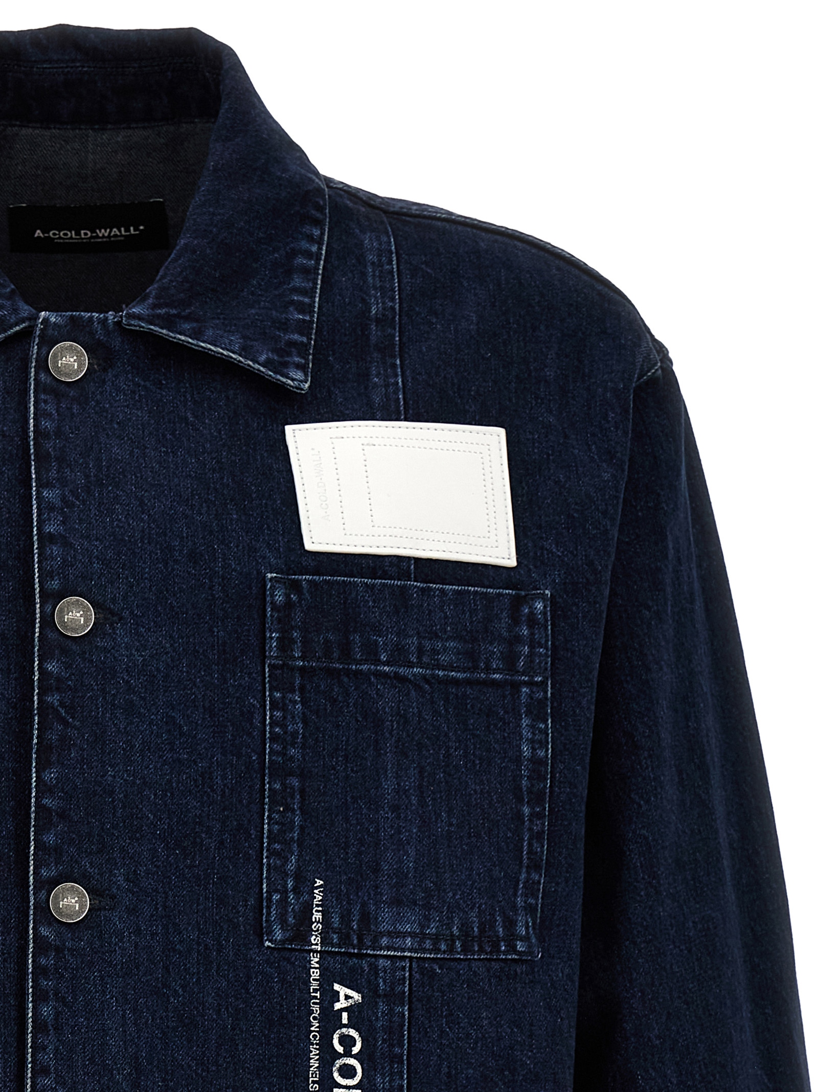 ‘Discourse Chore’ cotton denim jacket with front logo print, button closure, pockets, long cuffed sleeves.