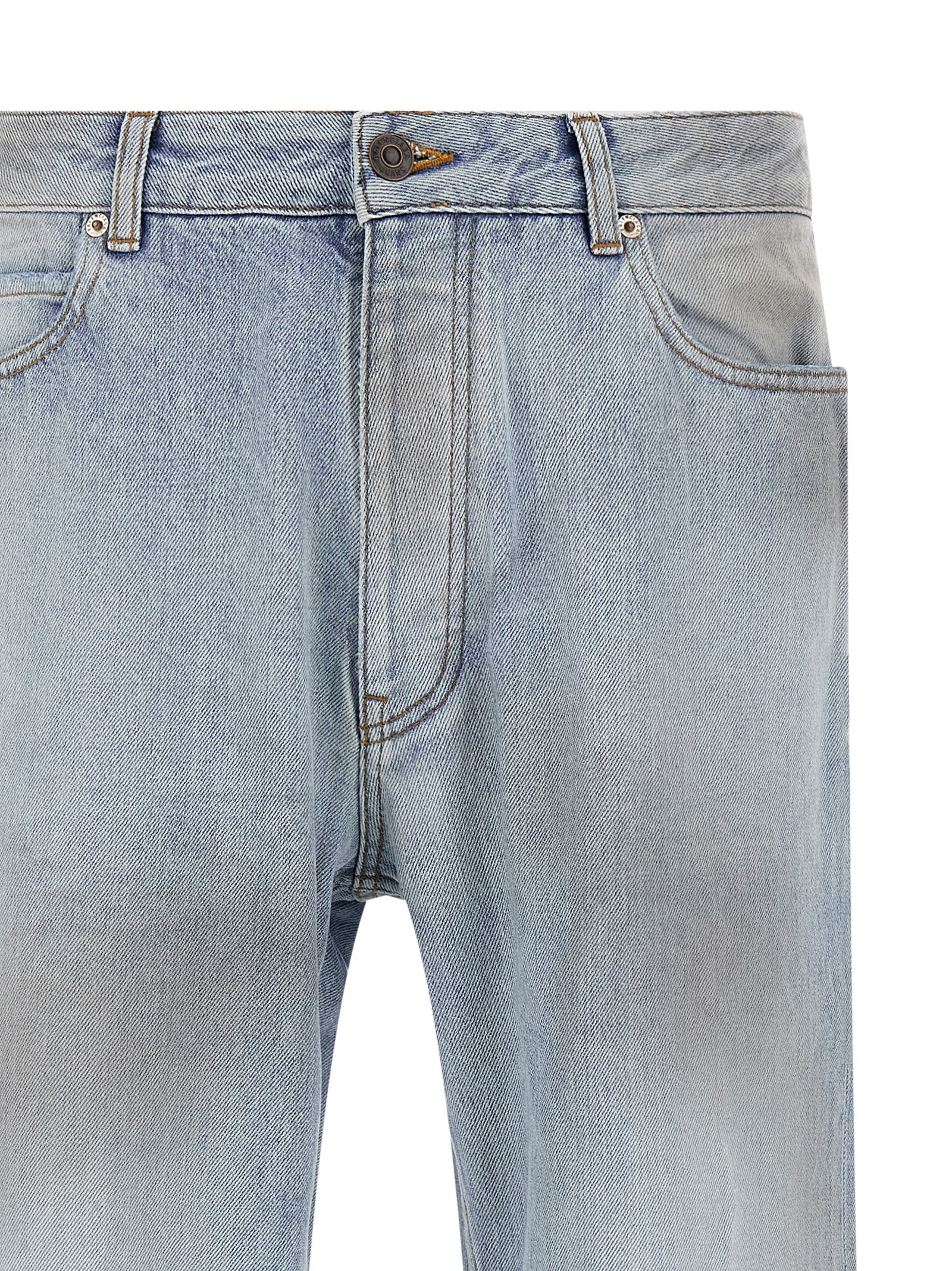 ‘Distressed’ cotton denim jeans with dirty and worn effect details, contrast stitching, wide and straight leg, medium waist, front button closure, five pockets, back logo tag.