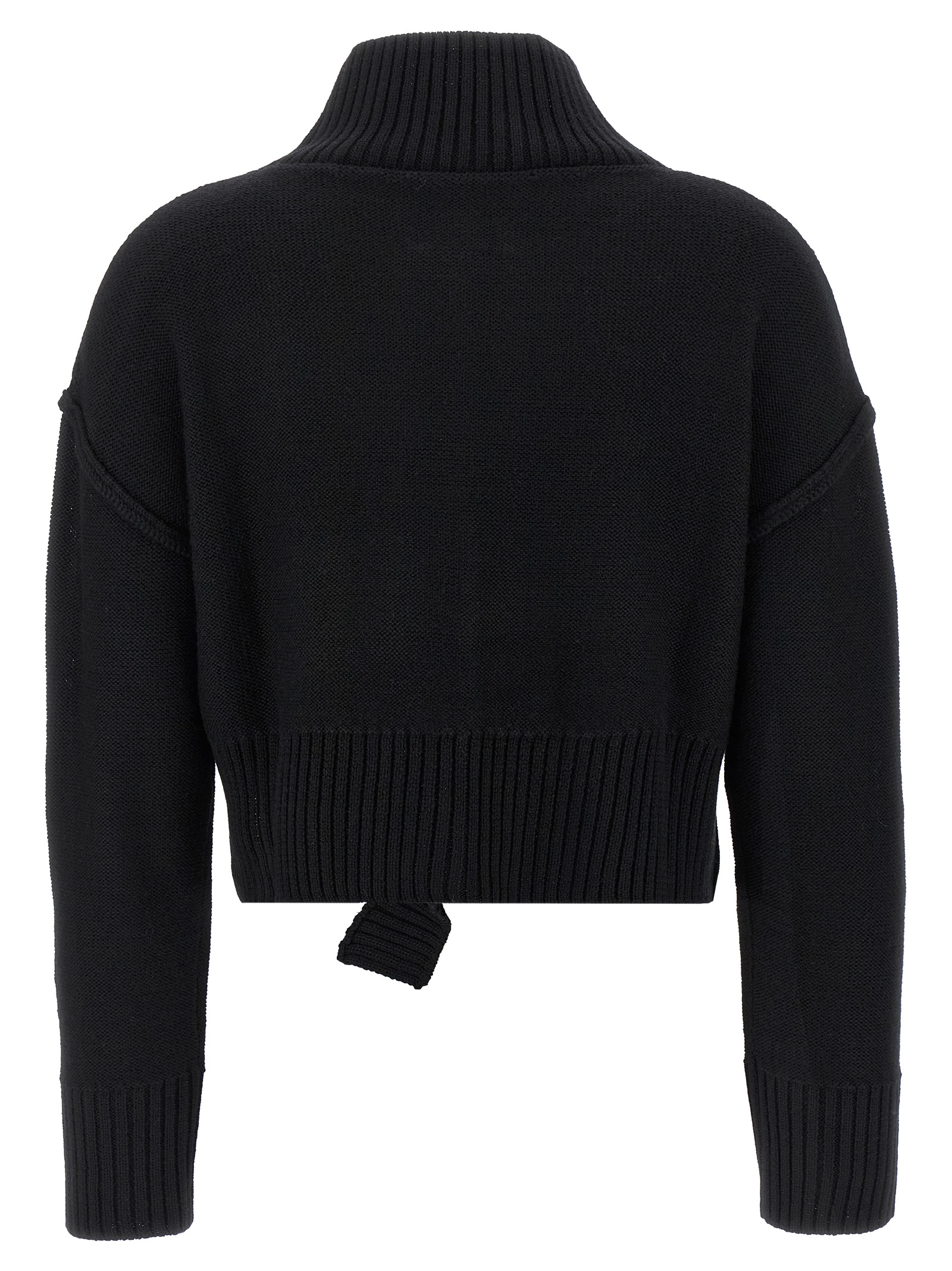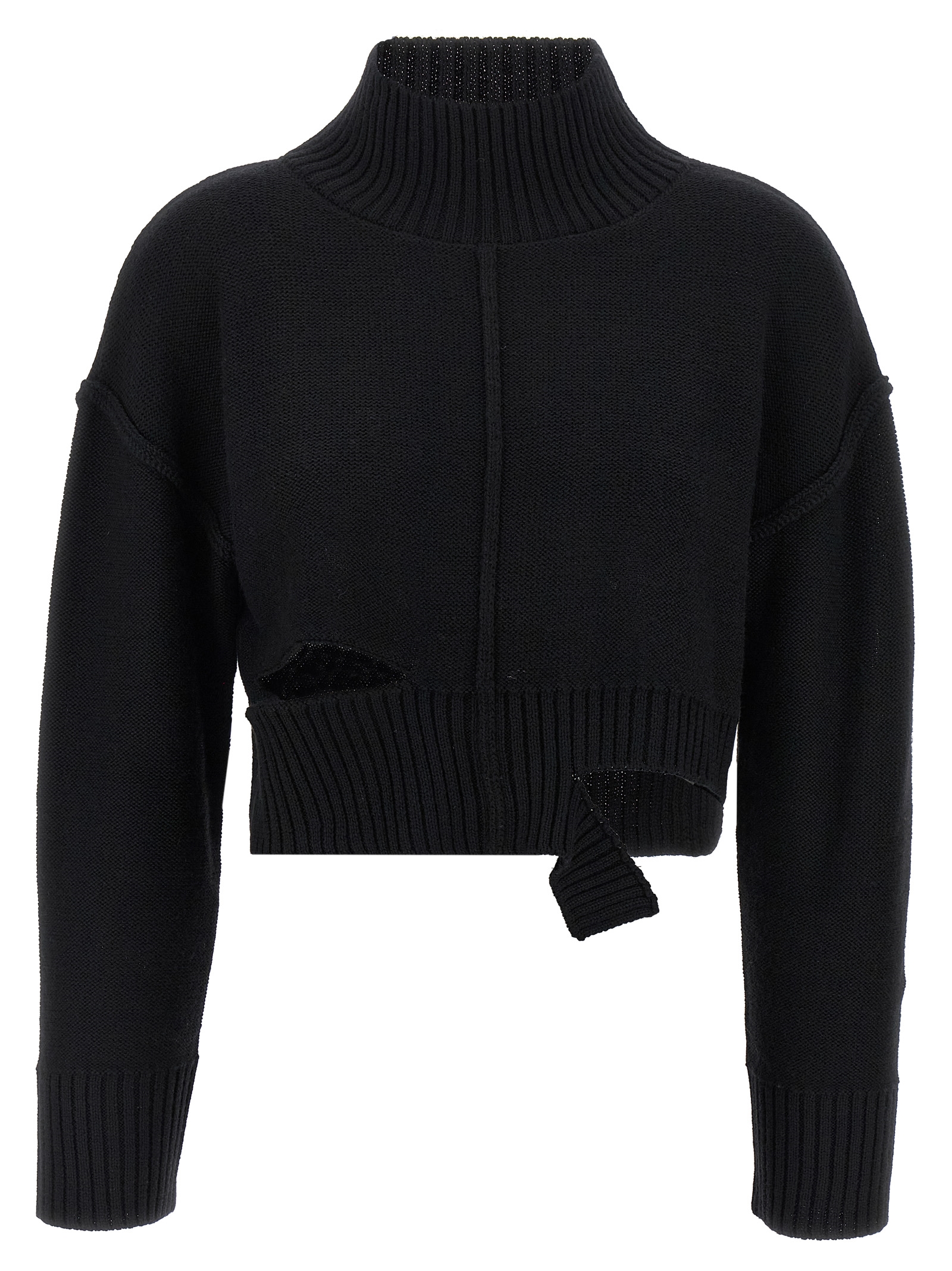 Sweater in wool blend fineness 5 distressed effect with torn details, crop model, high neck, long sleeves with cuffs and dropped shoulder, ‘White stitch line’ back.