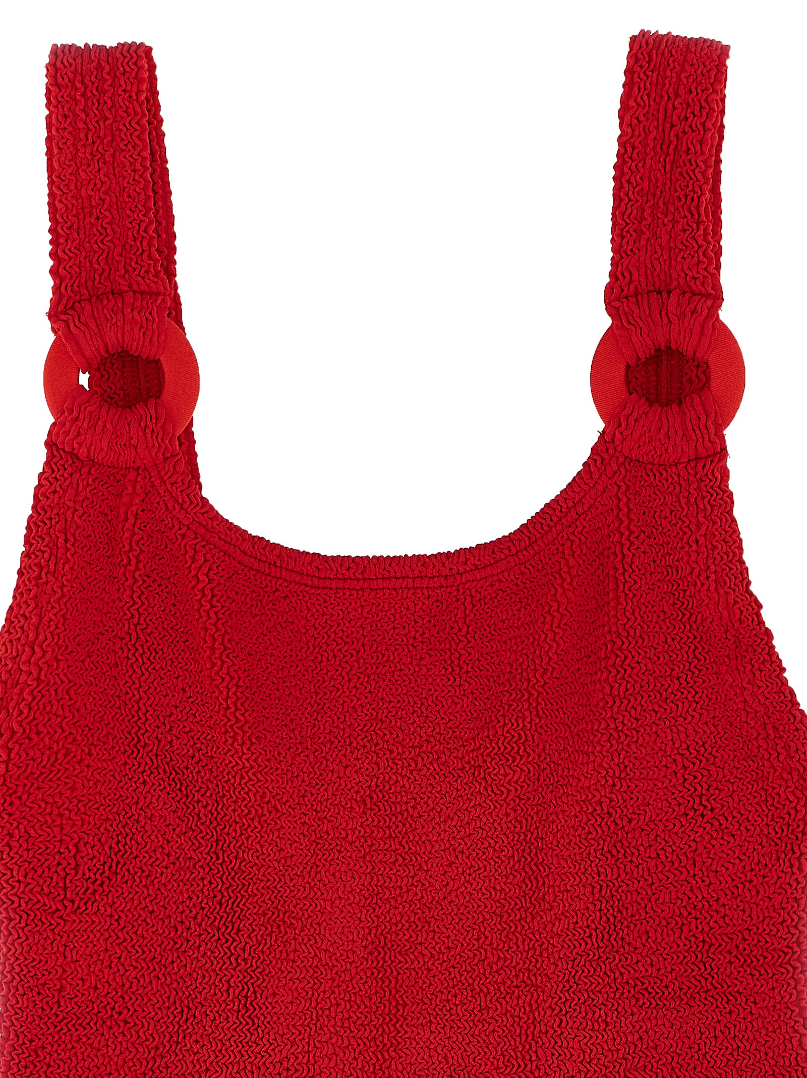 ‘Domino’ one-piece swimsuit in The Original Crinkle™ fabric with wide back round neckline, front round neckline, cut-out tone-on-tone circles on shoulder straps, medium breast support, classic hem coverage.