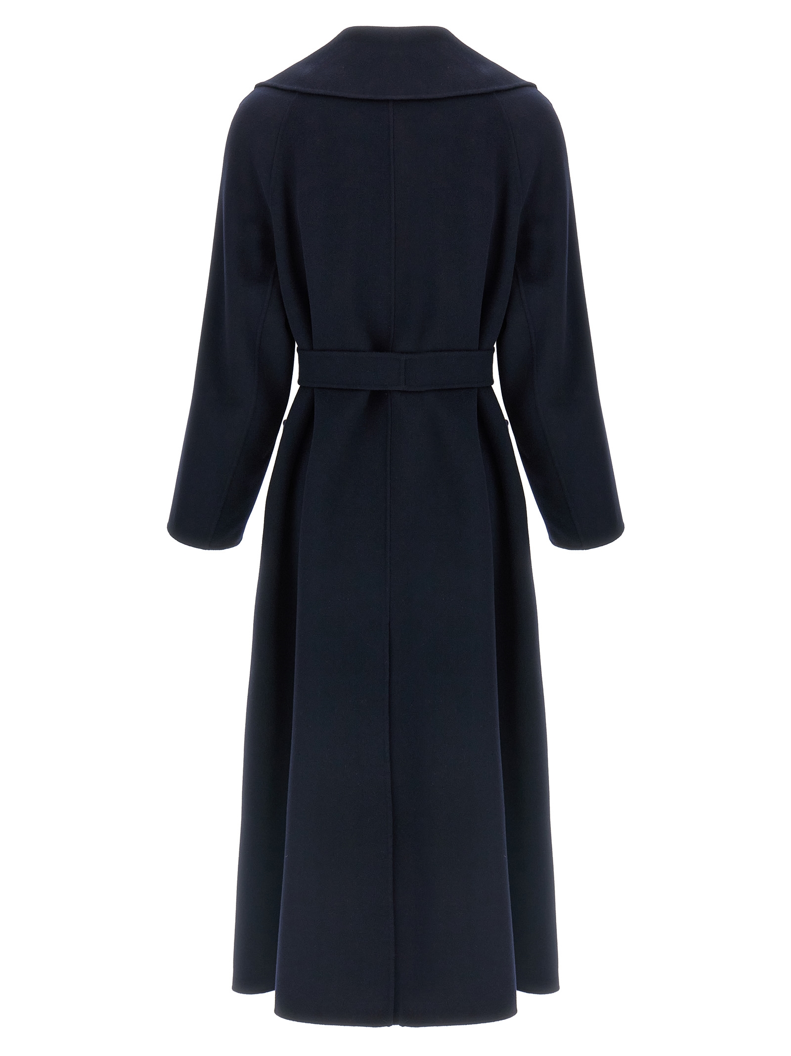 ‘Doris’ long coat in hand-stitched pure wool double fabric with dressing gown style, pockets, long sleeves, back split, unlined, removable belt.
