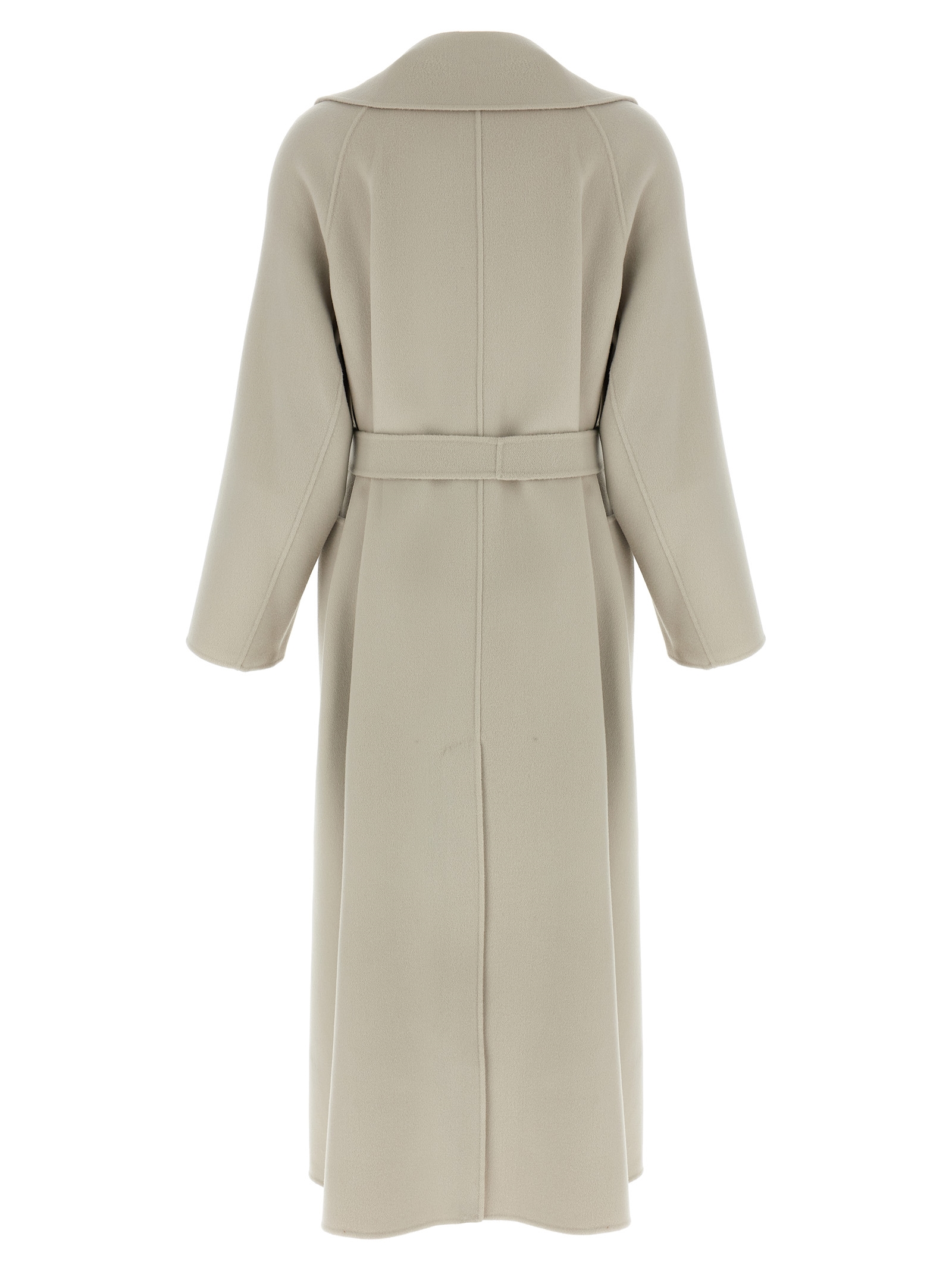 ‘Doris’ long coat in hand-stitched pure wool double fabric with dressing gown style, pockets, long sleeves, back split, unlined, removable belt.