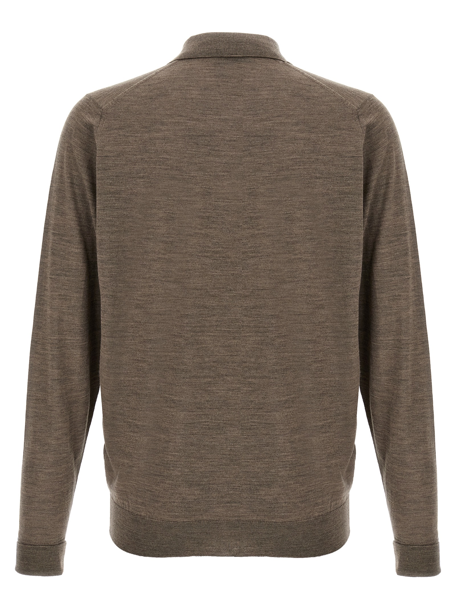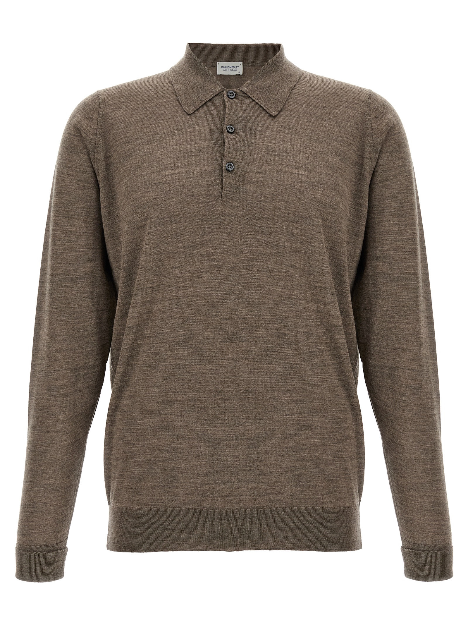‘Dorset’ fine wool polo shirt style sweater with shirt collar, two button closure, long cuffed sleeves.