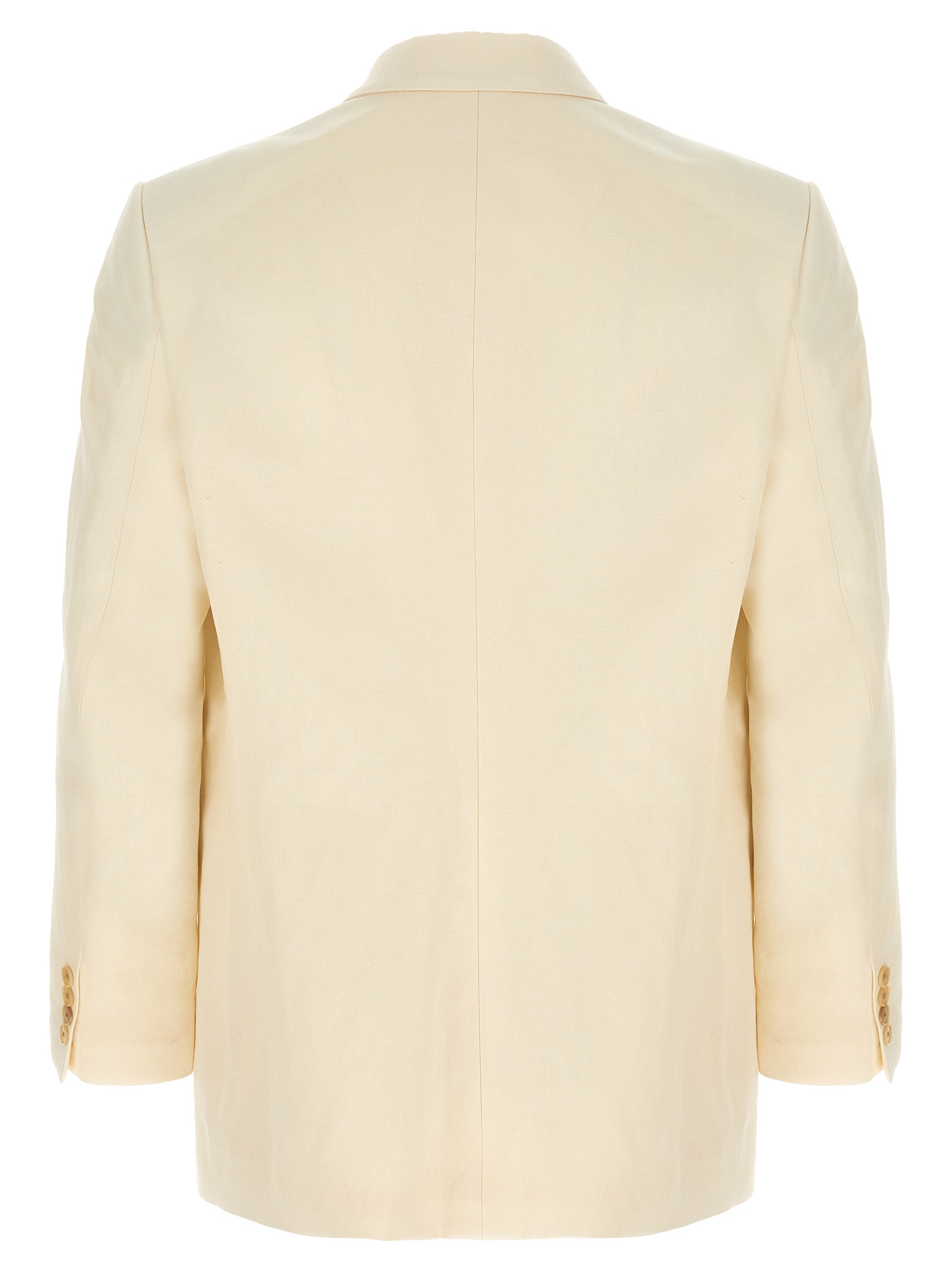 Blazer in Oxford fabric densely woven with a wool, cotton and linen blend yarn, double-breasted style with front horn button closure, peak lapels, chest pocket, flap pockets, structured shoulder strap, buttonless cuffs, cupro lining, and two inner pockets.