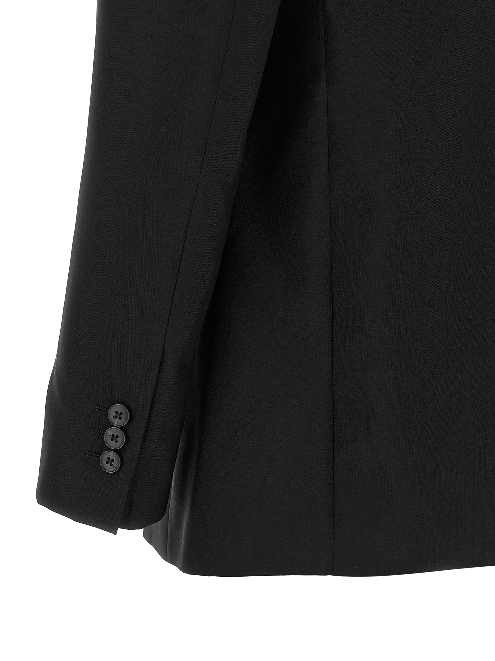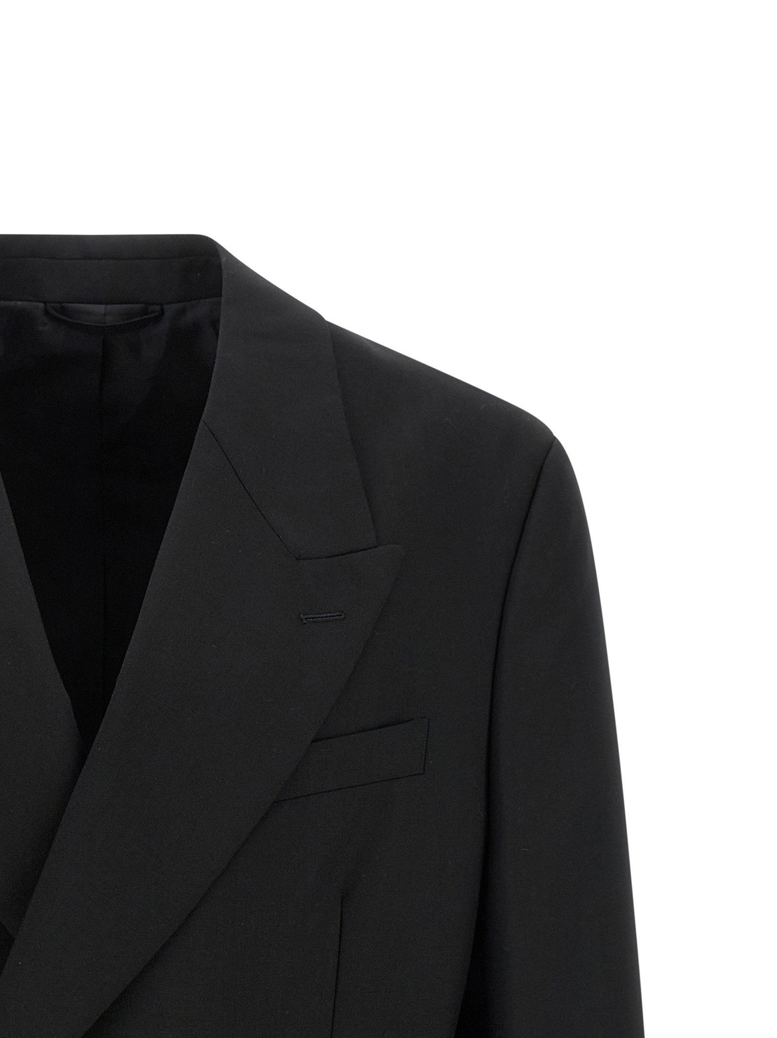 Double-breasted blazer in Italian tropical wool with two front button closure, peak lapels, breast pocket, flap pockets, structured shoulder strap, cuffs with opening buttonholes, back split, half lining, and two inside pockets.