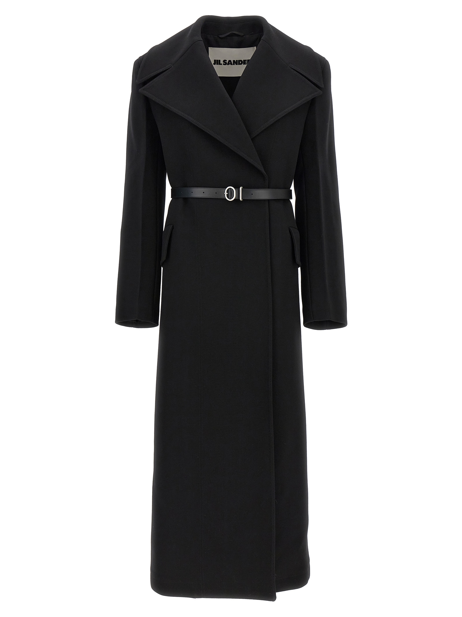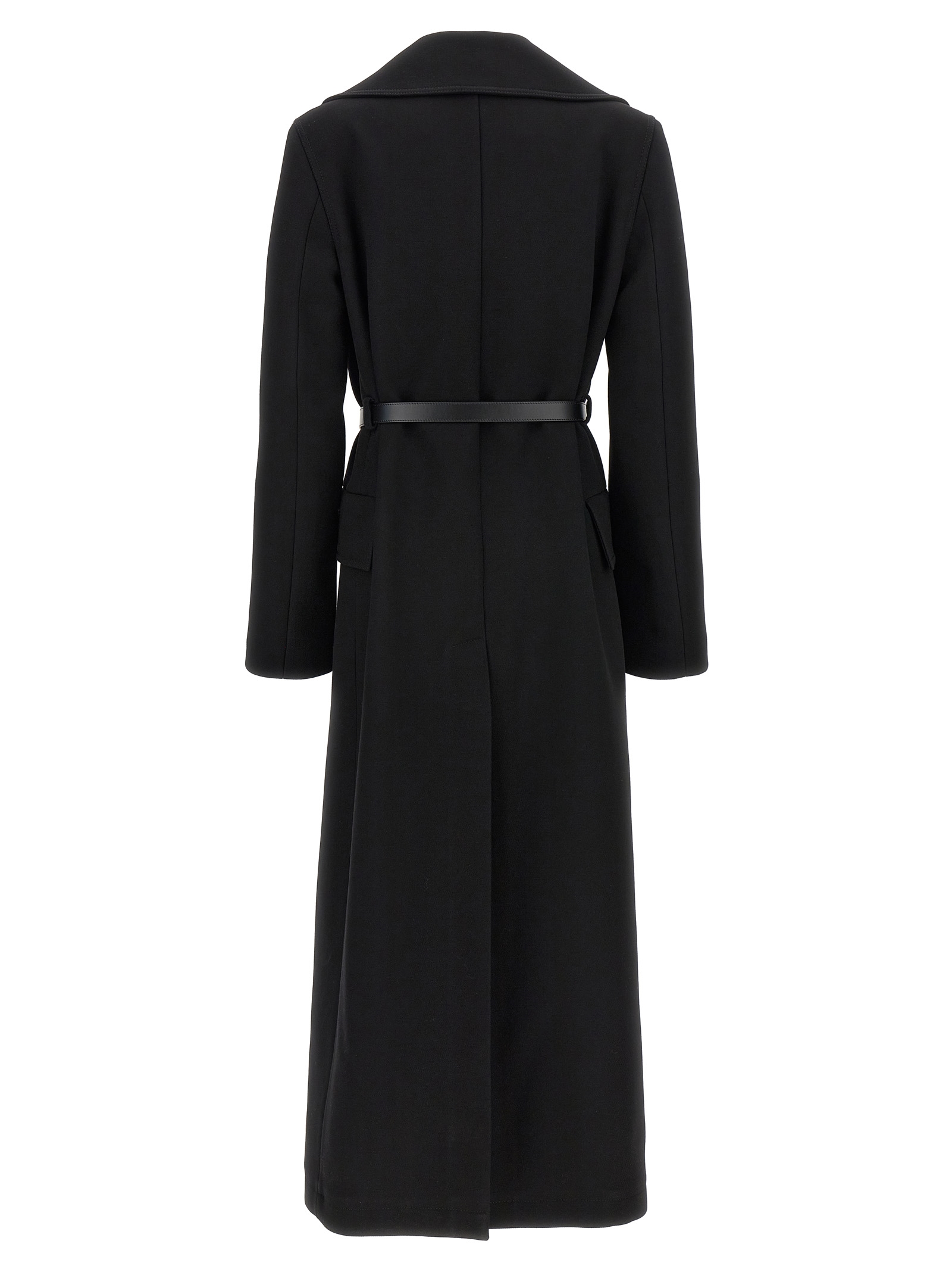 Compact wool double-breasted coat with button closure, pockets, padded shoulders, long sleeves, back vent, leather tie belt at the waist.