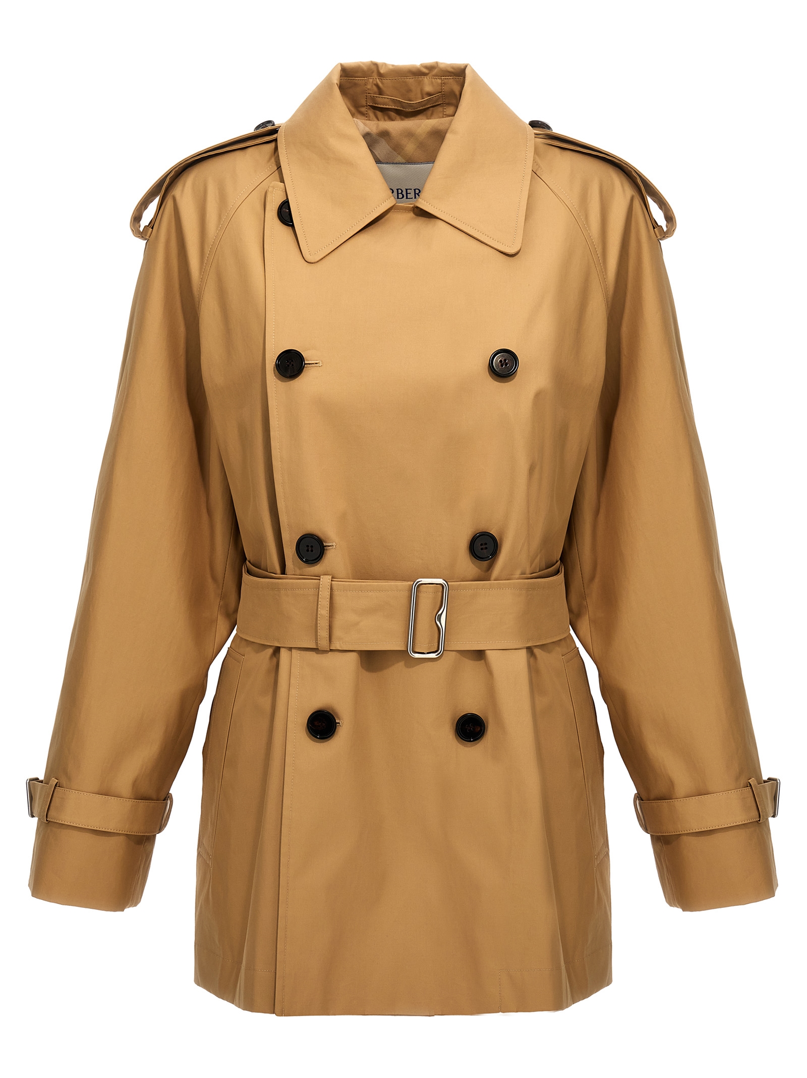 Double-breasted short cotton trench coat with check lining and belt at the waist, button closure, side pockets, long sleeves with adjustable straps
