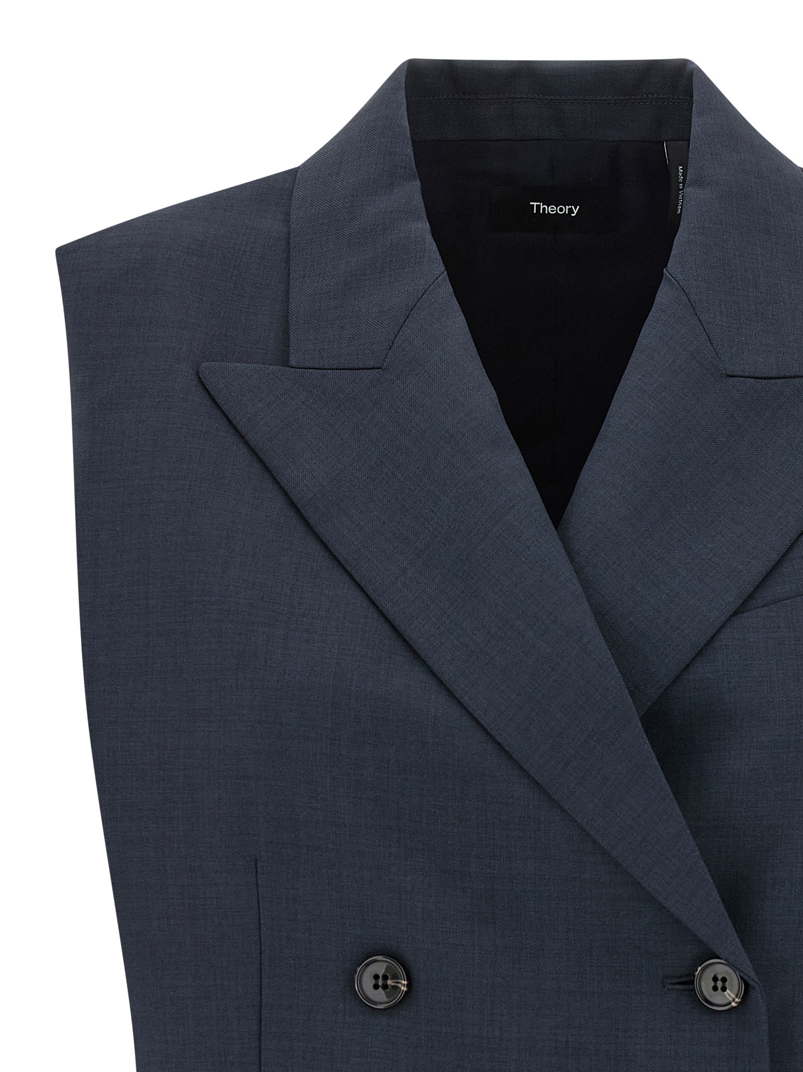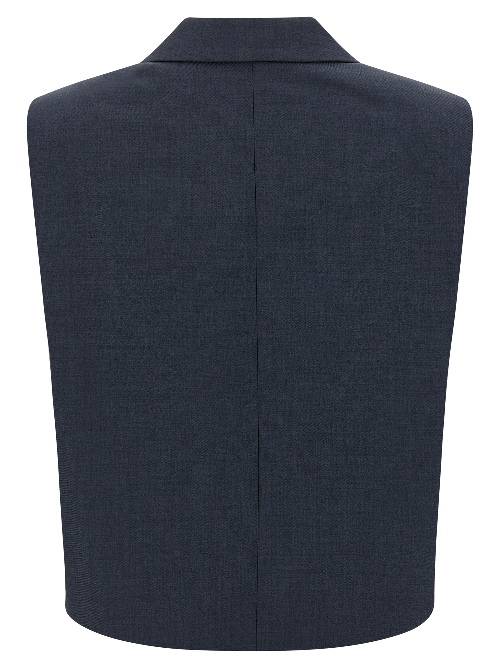 City Twill vest, slightly cropped double-breasted style with front button closure, peak lapels, chest pocket.