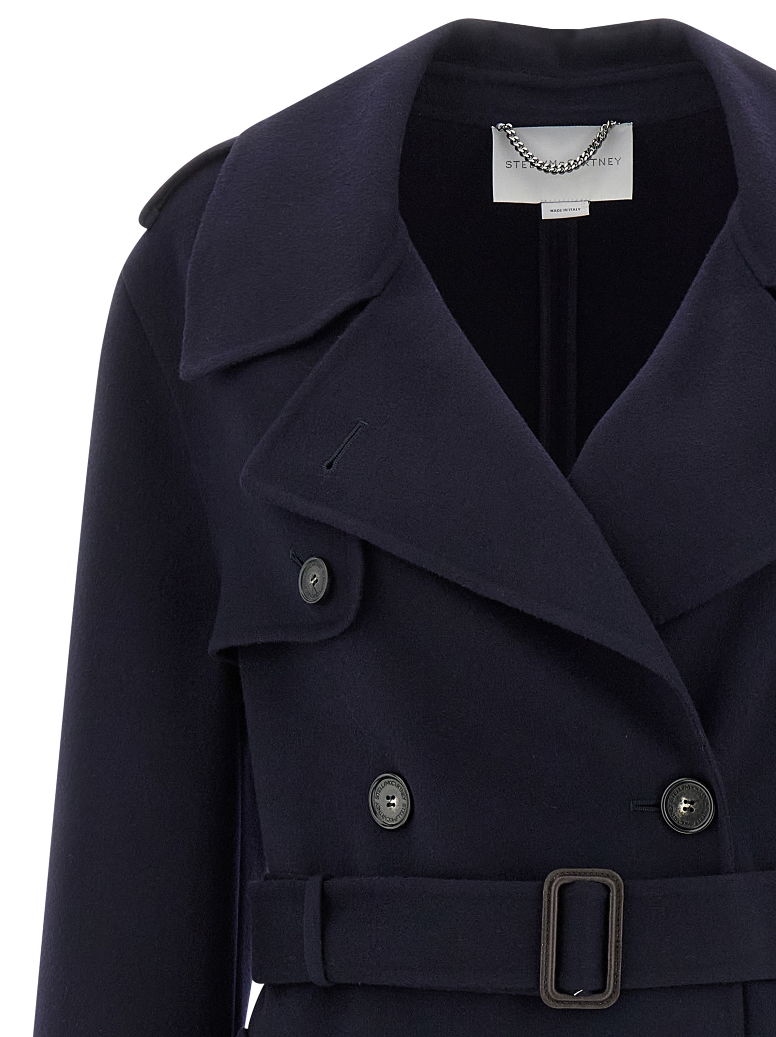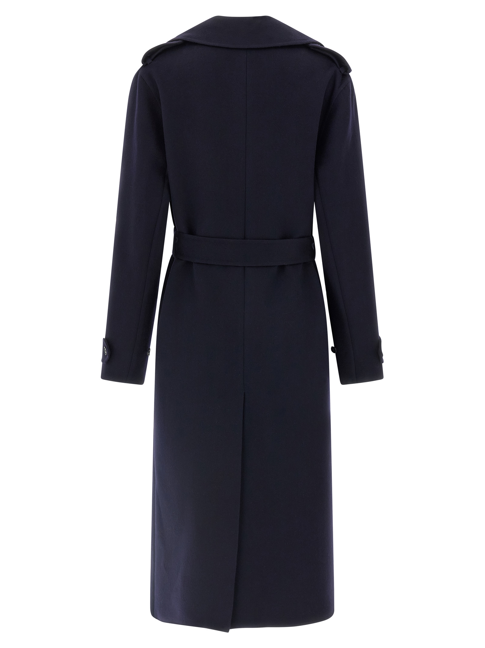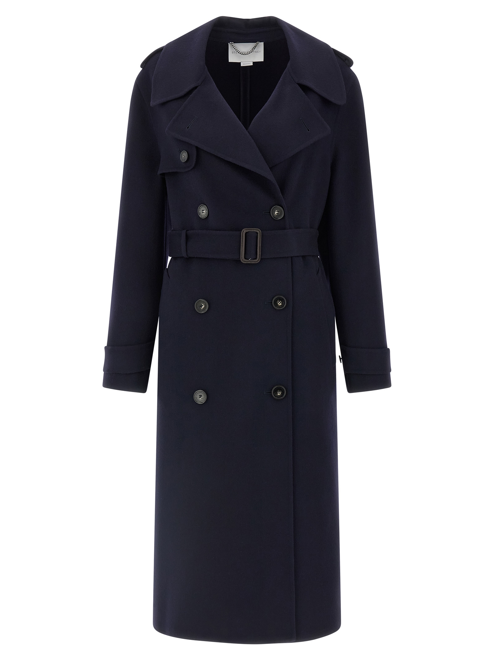 Double-breasted double-breasted wool trench coat with front button closure, pockets, long cuffed sleeves, and back split.