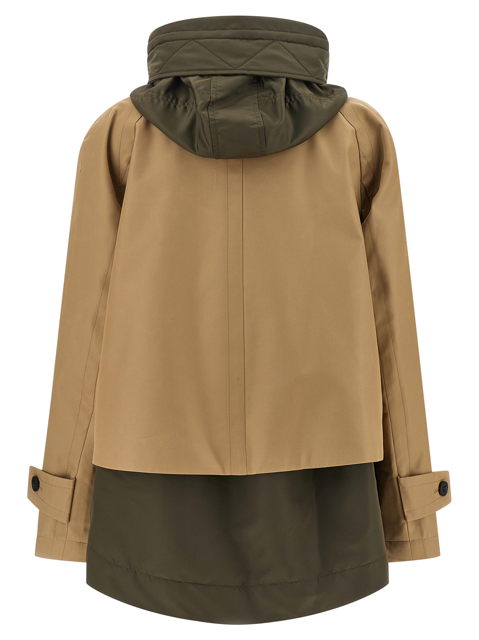 Double layer jacket consisting of longer nylon parka underside with adjustable hood, front zip and button closure, inner drawstring, pockets and shorter upper part cotton gabardine trench coat style, collar with contrast interior, removable chinstrap, front button closure, pockets, long sleeves.