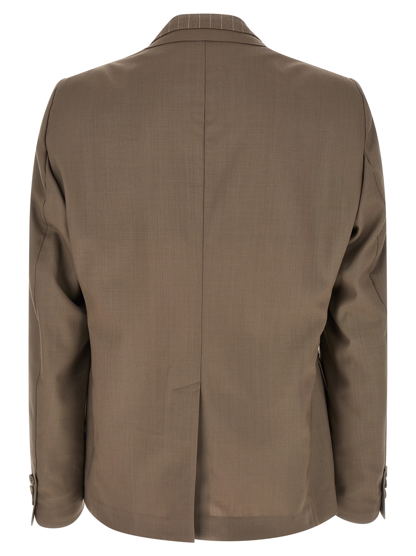 Double-breasted wool blazer with horn button closure and front logo patch, double layer tooth lapels with tone-on-tone pinstriped wool insert, breast pocket, flap pockets, structured shoulder strap, cuffs with open buttonholes, back split, half lining, and an inner pocket.