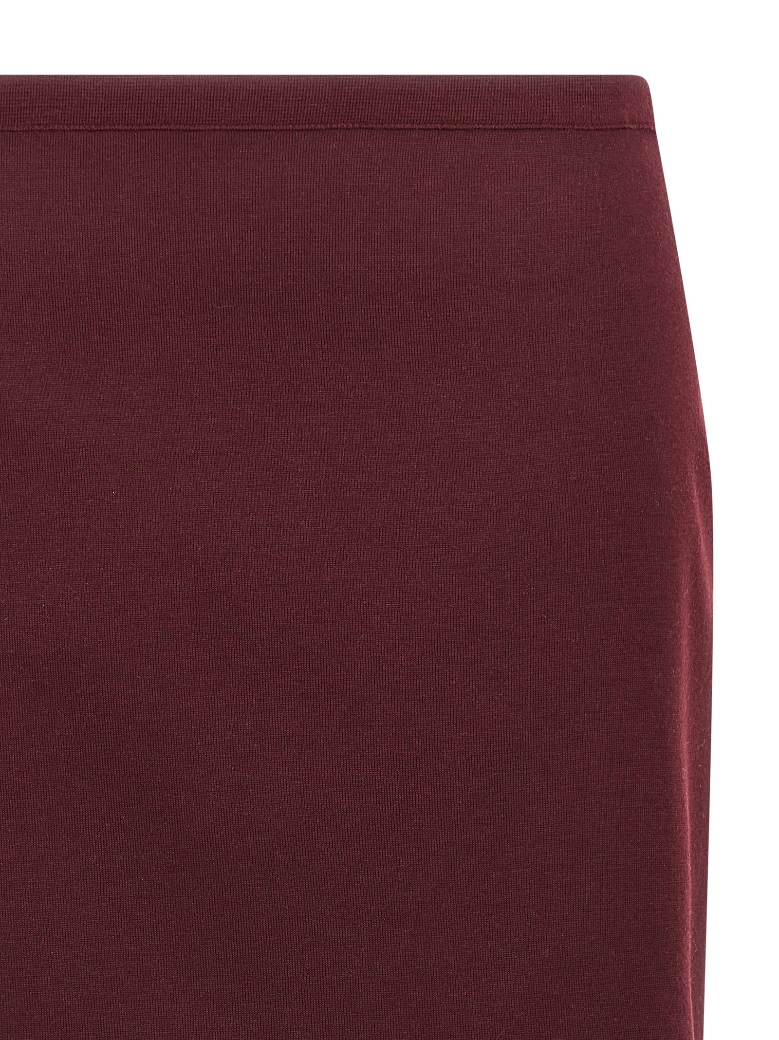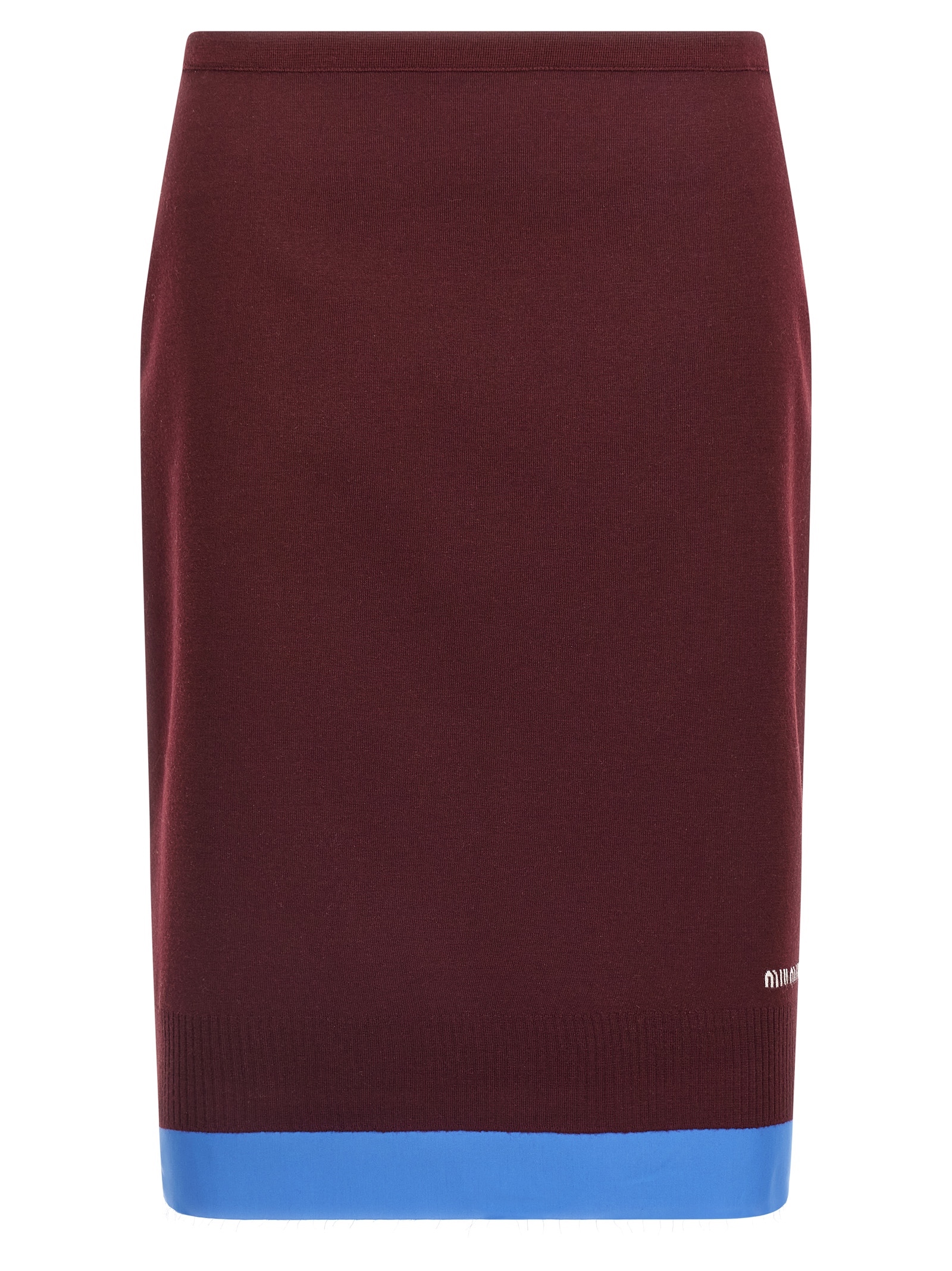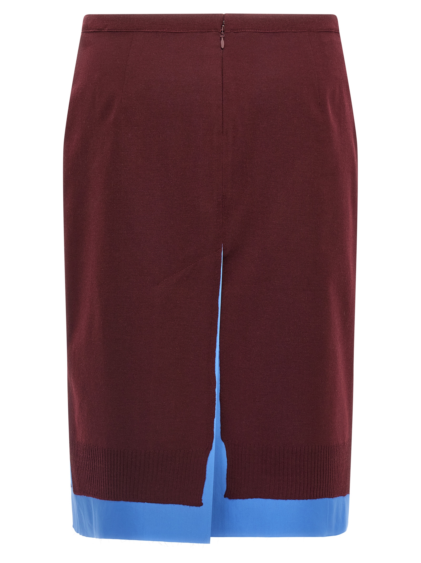 Double layer virgin wool midi skirt with front logo intarsia and asymmetric cotton poplin lining, longuette model, slit and back zip closure.