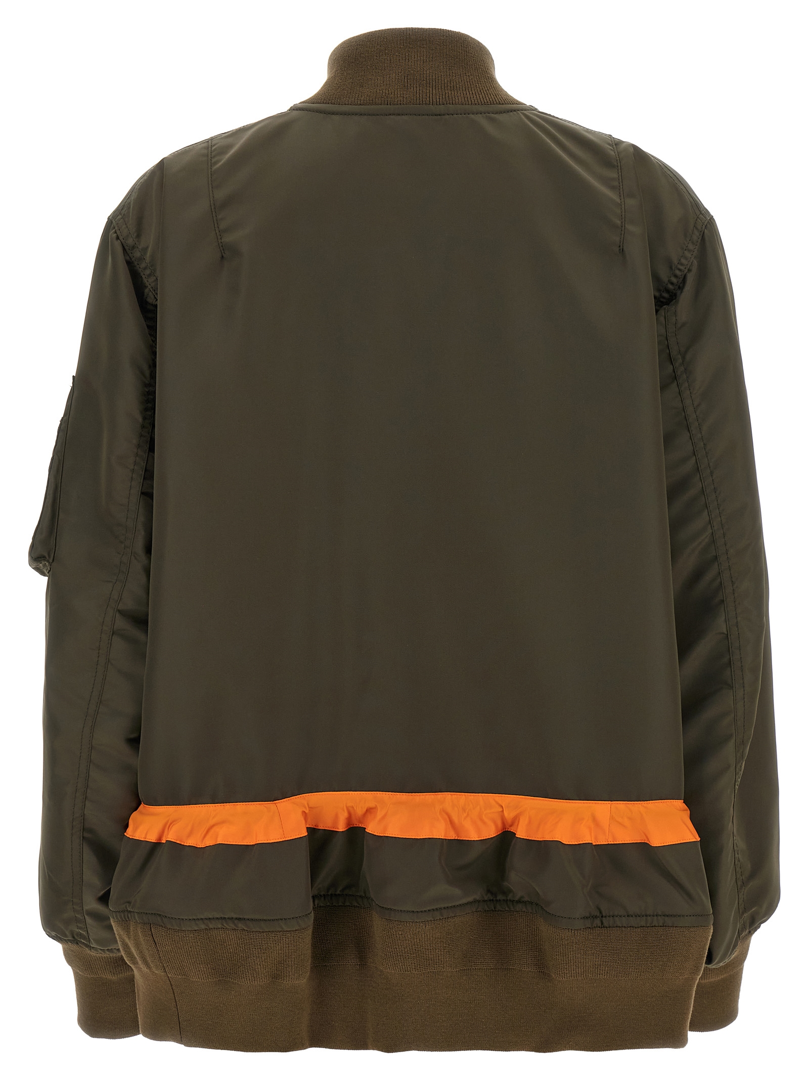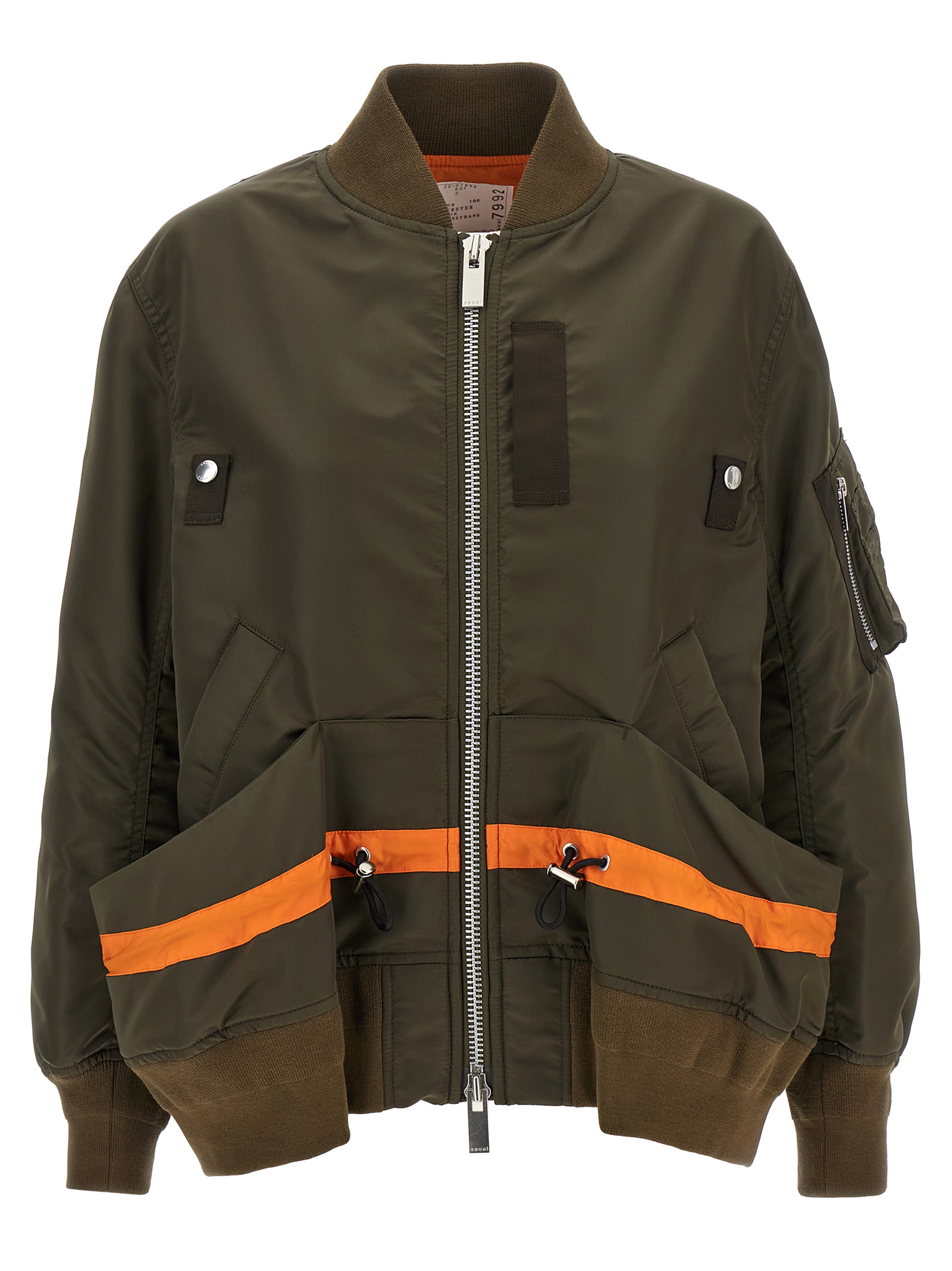 Nylon bomber jacket, wide fit with pockets, contrast inserts, front zip closure, knitted collar and cuffs, drawstring detail on the hem.