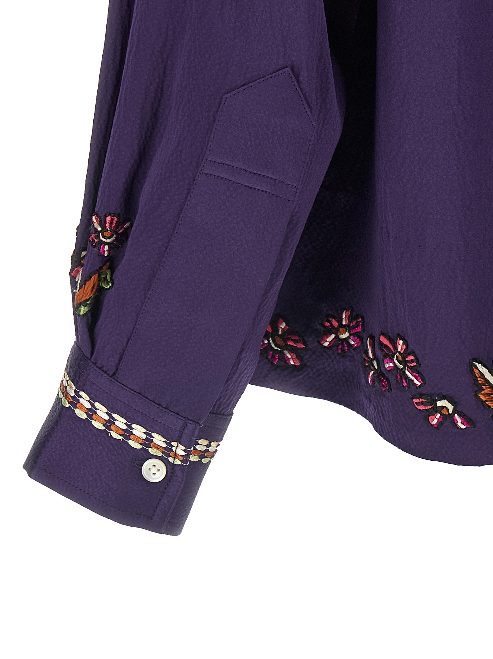 ‘Dream Souvenir’ structured silk shirt with embroidered floral motifs, bowling pattern, front button closure, long cuffed sleeves.