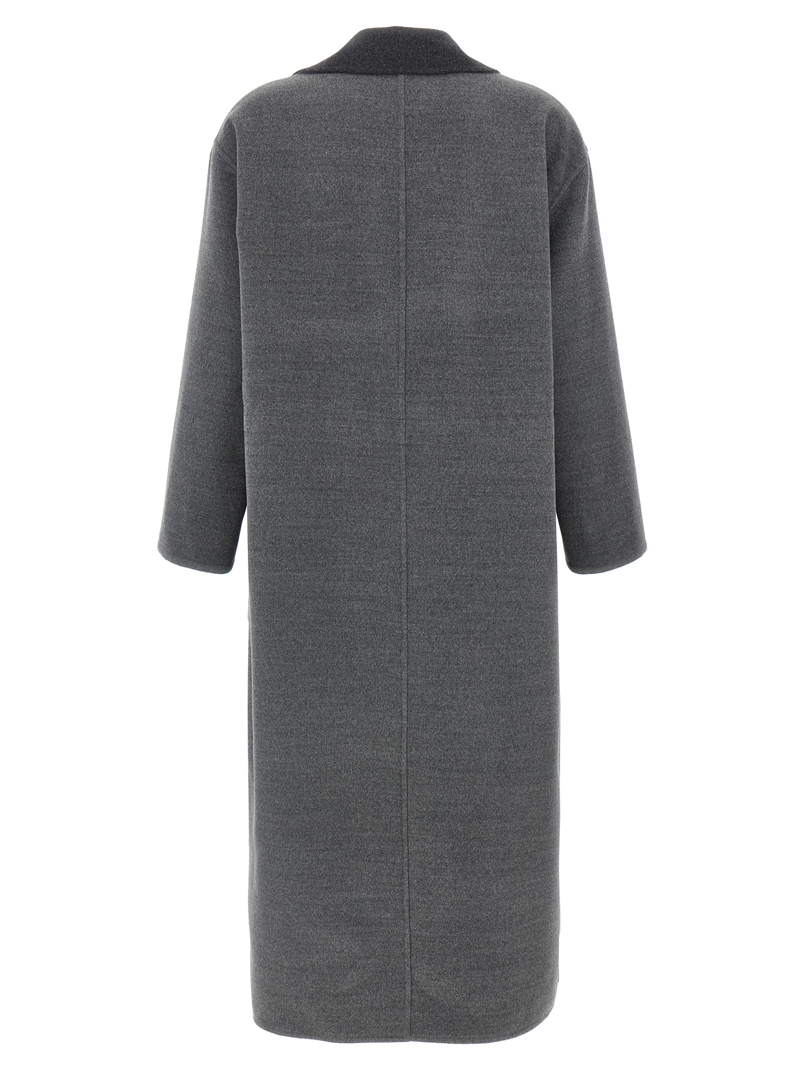Virgin wool coat, robe style with front snap button closure, pockets, long sleeve with metallic jewel detail in inner cuff, unlined, side slits, drawstring waist.