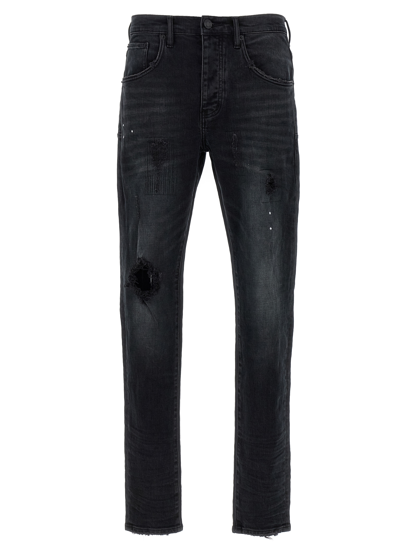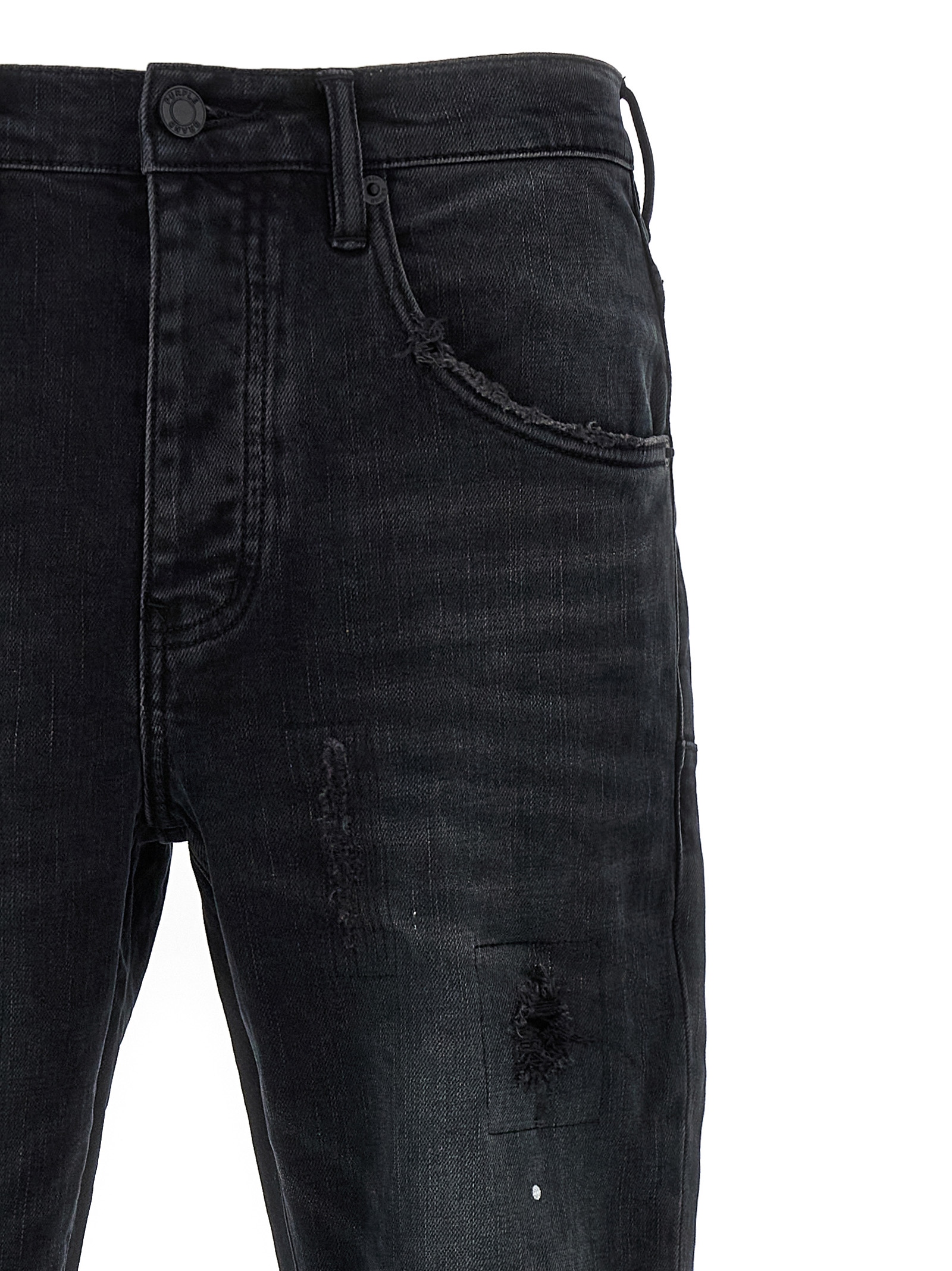 ‘Dropped fit’ stretch cotton denim jeans with destroyed details, mid waist, straight and narrow leg, button closure.