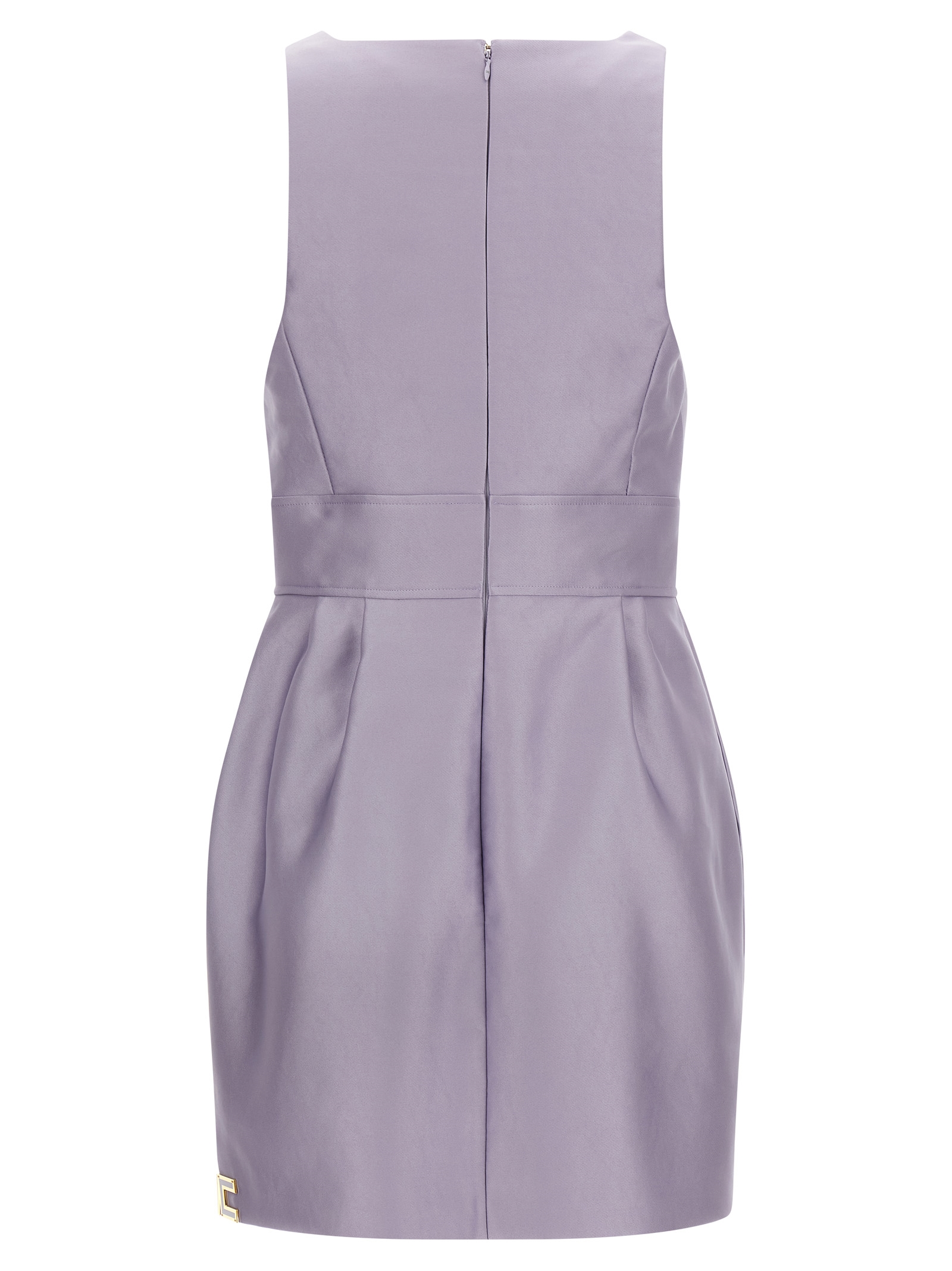 Duchesse mini dress, round neckline, draping on left shoulder, hourglass silhouette, side split with metal logo appliqué, sleeveless, pockets, back zip closure, satin lining.