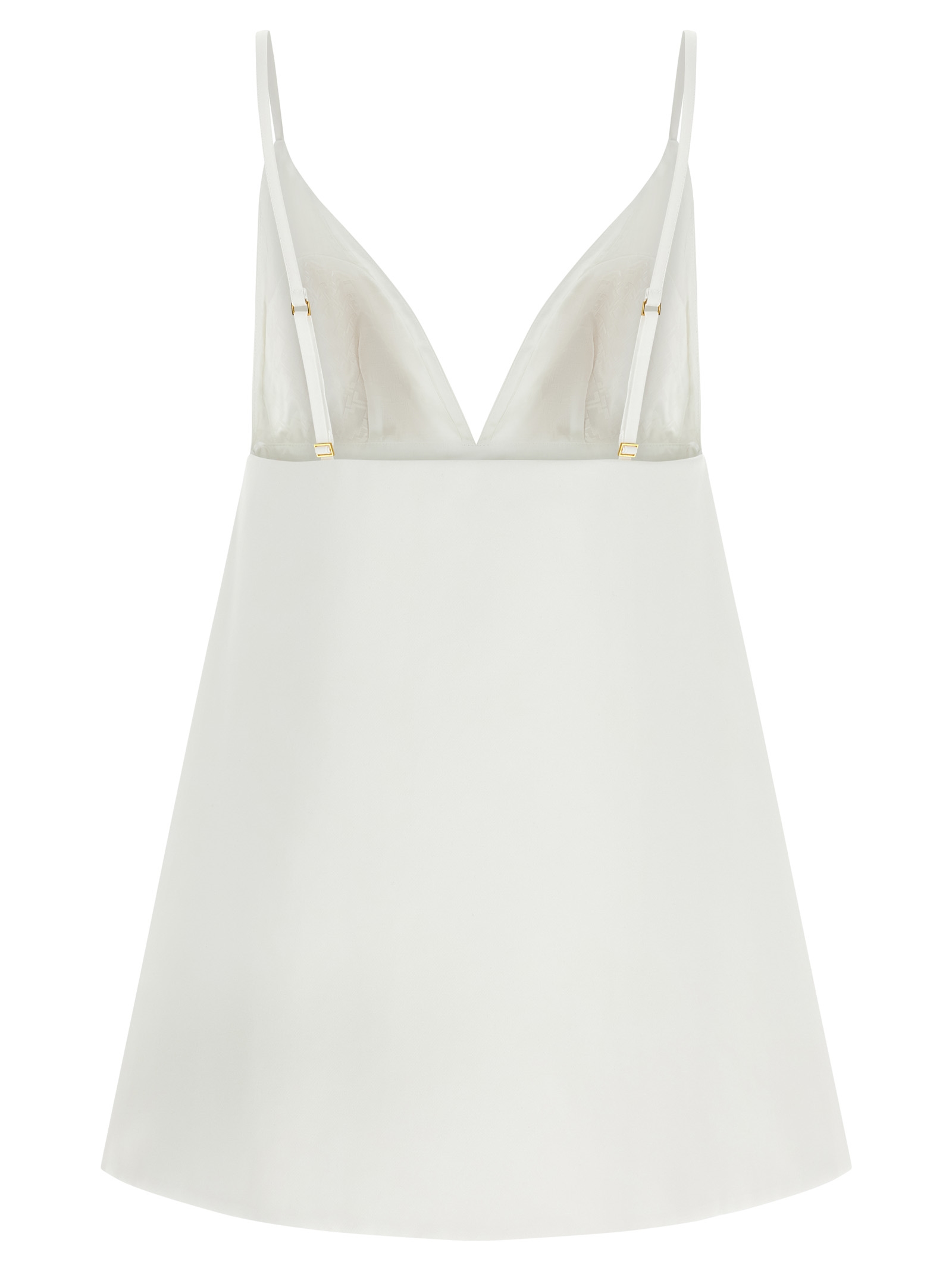 Duchesse mini dress with back cape construction, wide front V-neck, thin adjustable straps, sleeveless, wide back neckline, side zip closure, monogram satin lining.