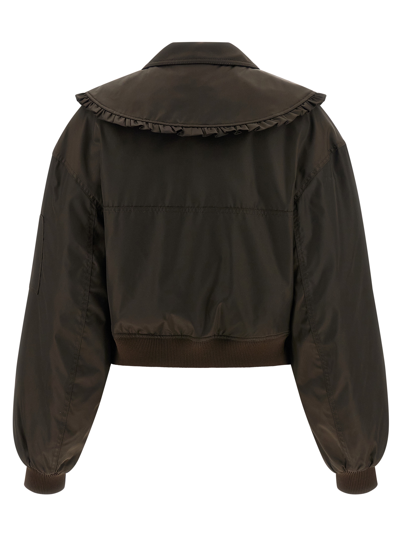Duchesse ‘Duchesse Nylon’ nylon bomber jacket with tone-on-tone stretch ribbed knit details, slightly cropped lapel with removable ruffles, shirt collar, front zip closure, pockets, long wide sleeves with cuffs and dropped shoulder, band on the hem, monogram viscose blend lining.