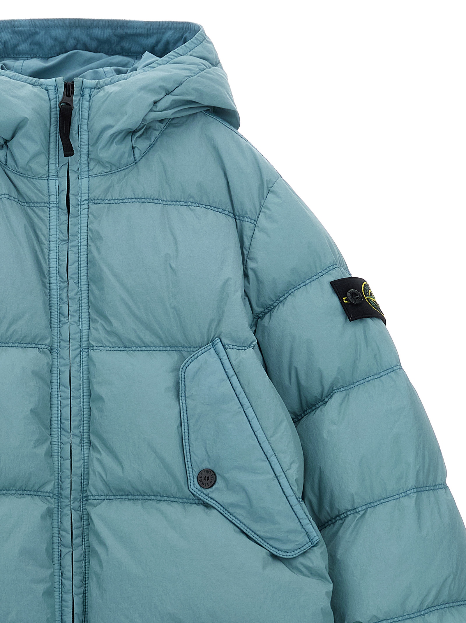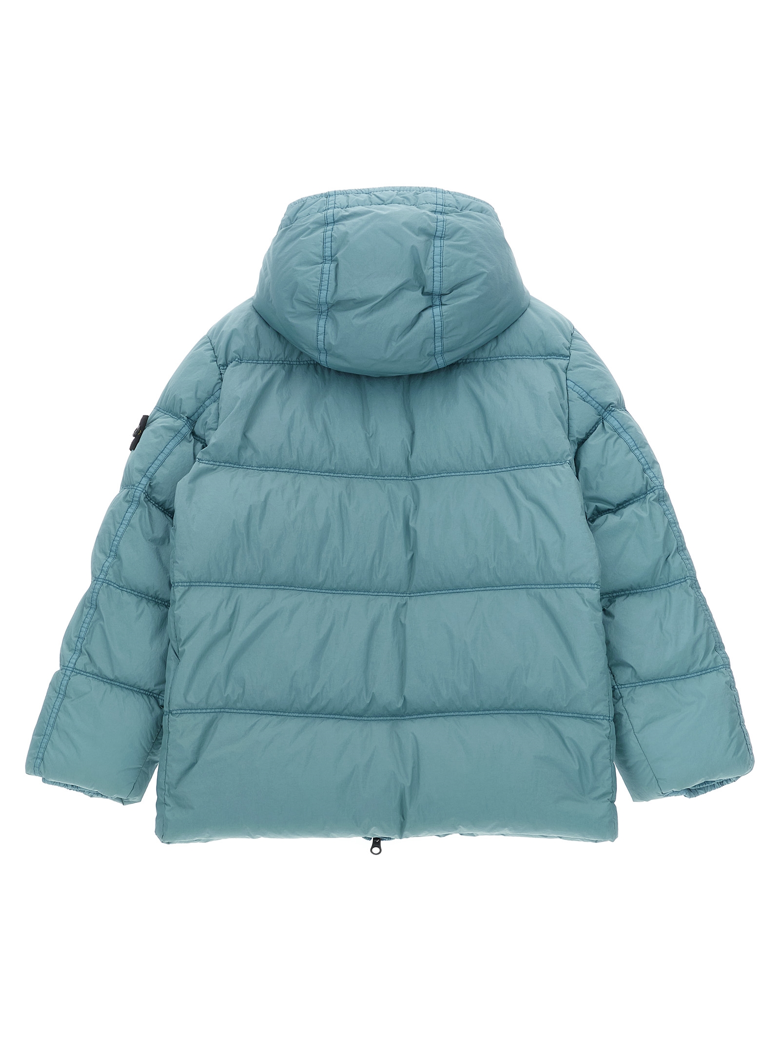 Dyed down jacket in quilted synthetic fabric with wrinkled goose down padding, hood, high neck, front zip closure, pockets, long sleeves with elastic cuffs and logo badge.