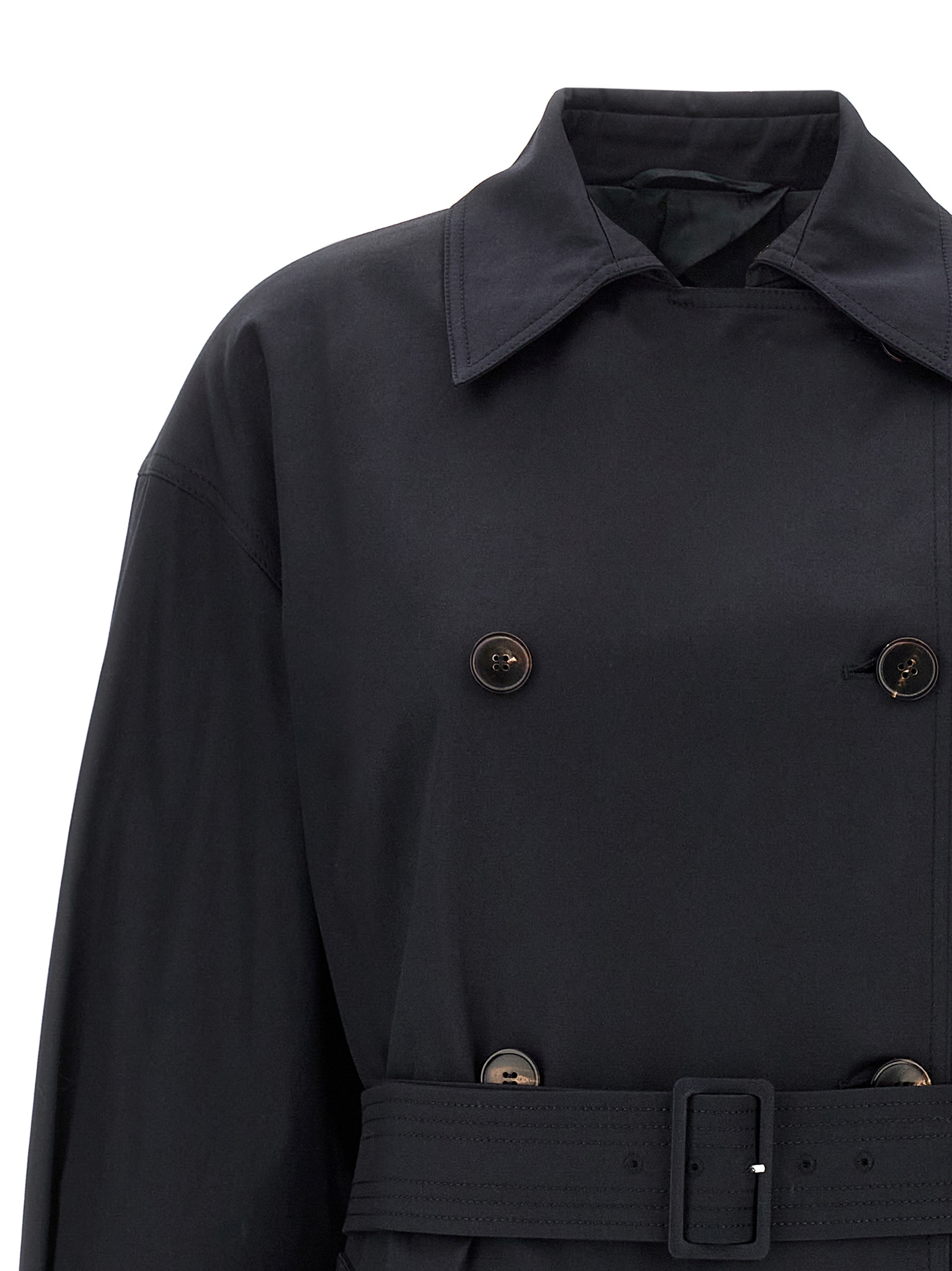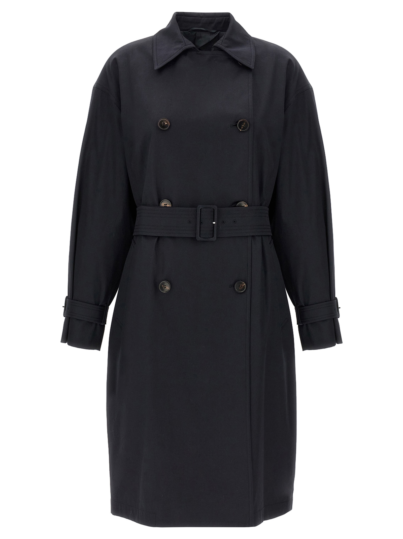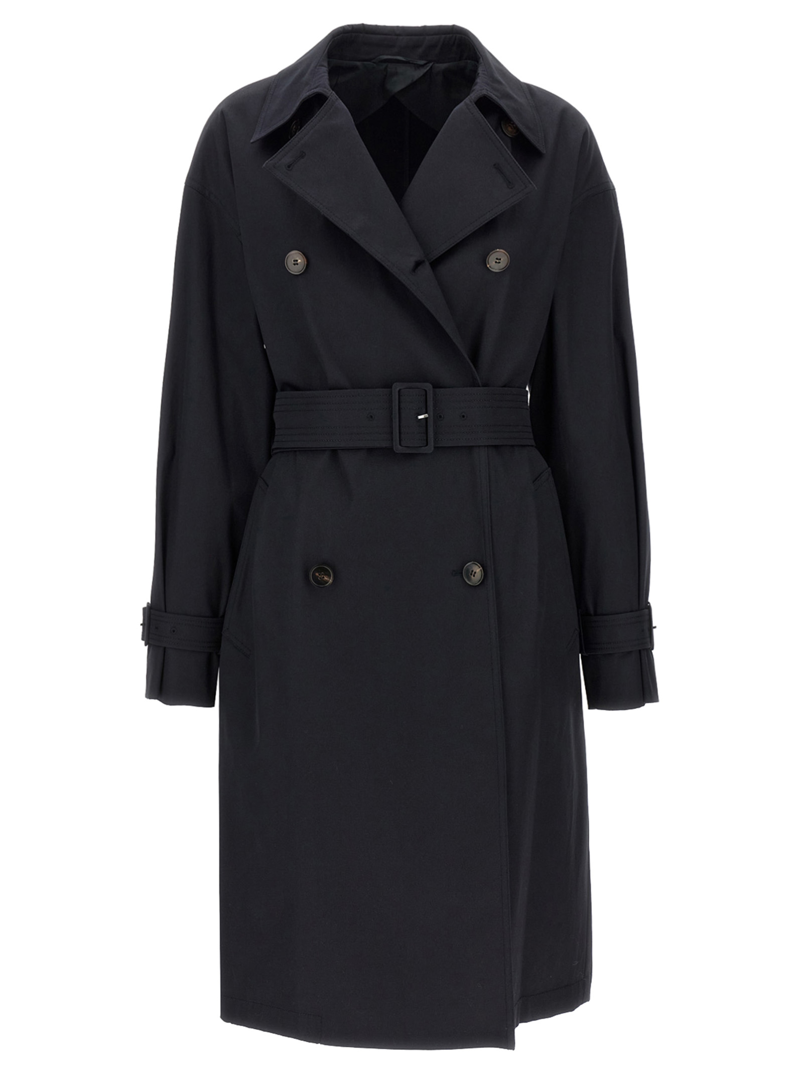 ‘Ebrien’ double-breasted cotton gabardine trench coat with buttons, adjustable waist belt with buckle, long sleeves with adjustable strap with buckles.