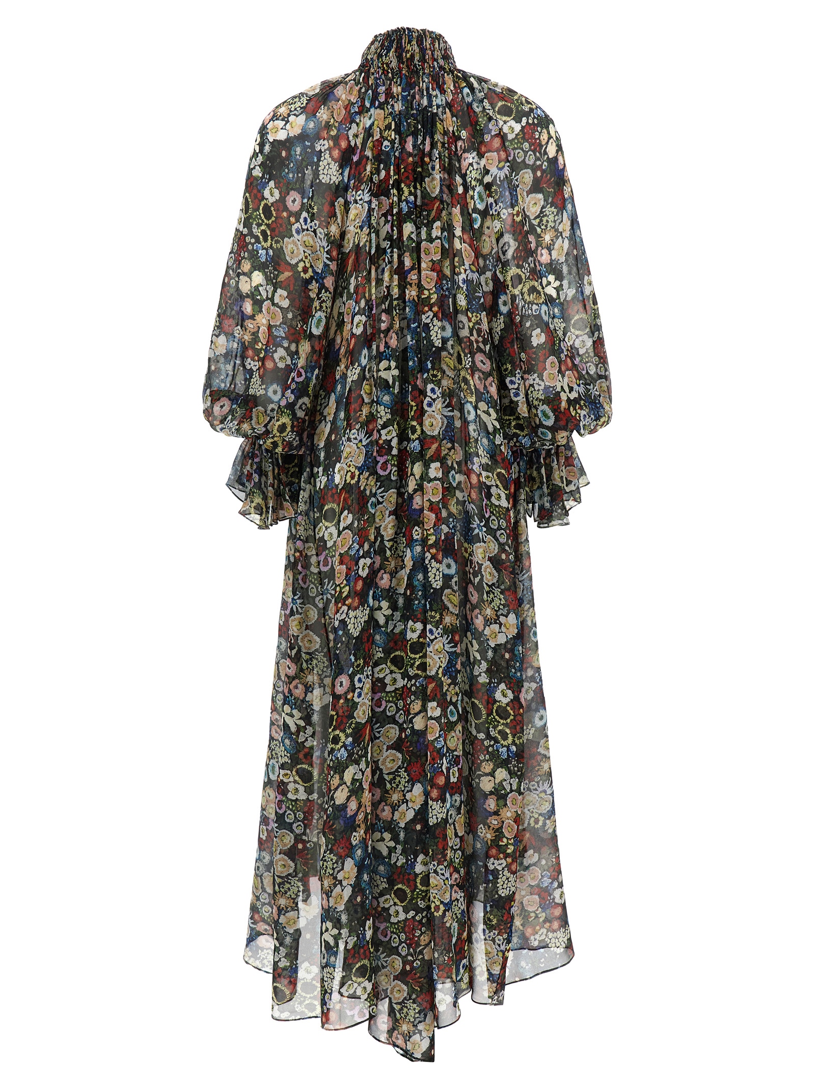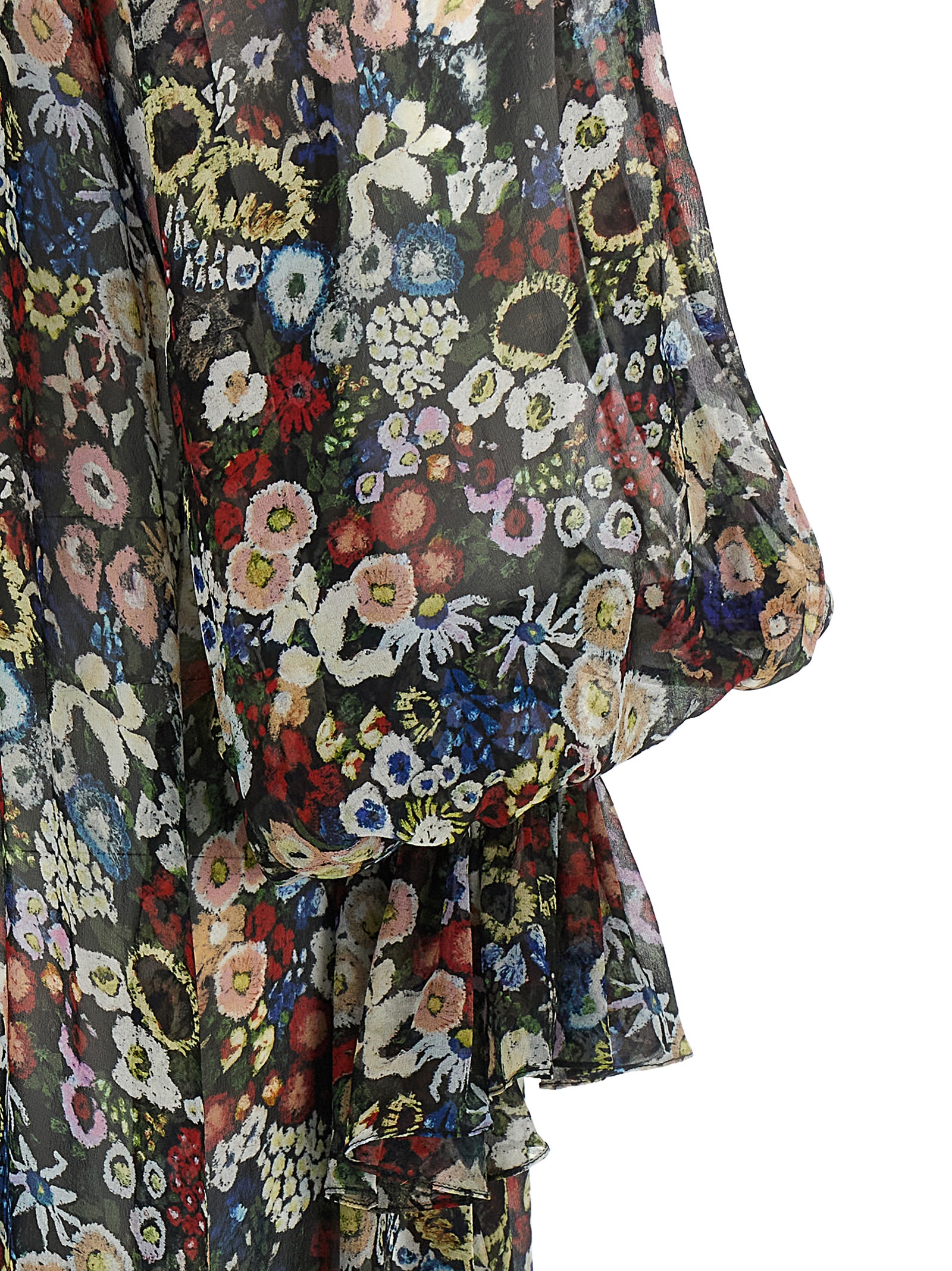 Long ‘Edgar’ dress in semi-transparent silk chiffon with all-over floral print, wide and asymmetrical pattern on the hem, curled high neck with front V-opening with hook, wide sleeves curled on the cuffs.