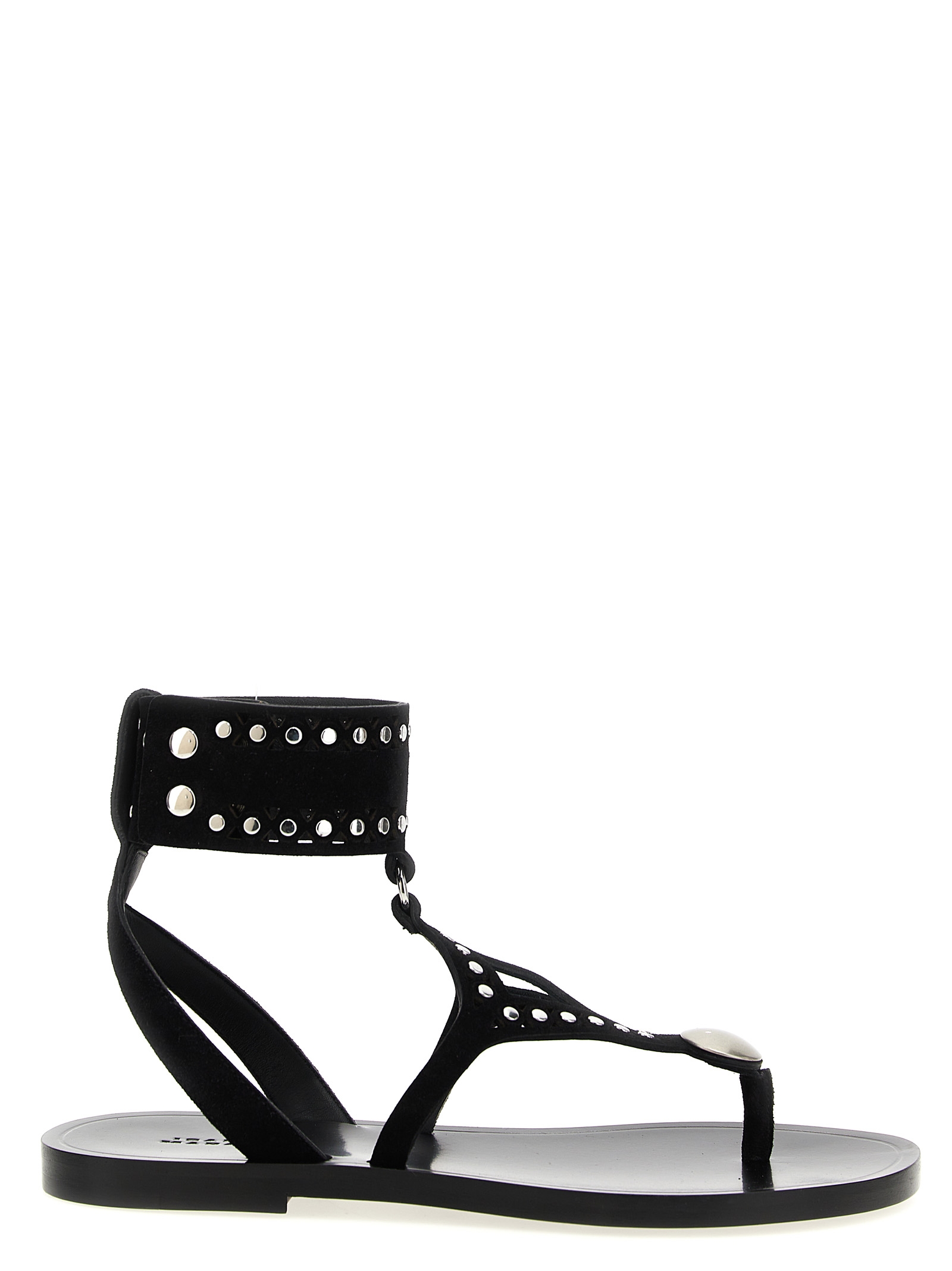 Edil’ suede sandals with cut-out details and all-over stud details, flip-flop style, adjustable strap with ankle snap buttons, leather sole.