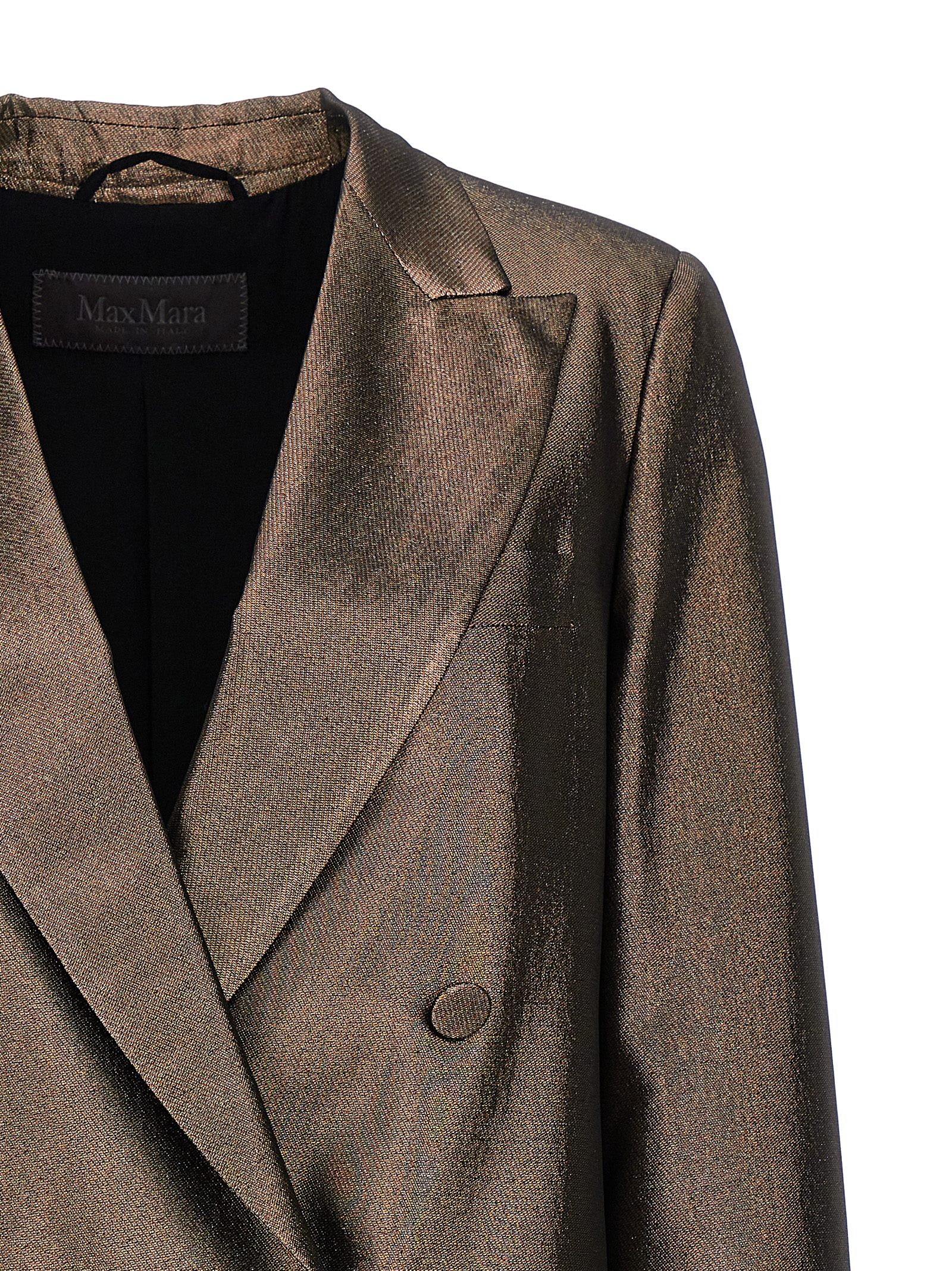 ‘Edro’ lamé blazer jacket in brown silk charmeuse, double-breasted button closure, peak lapels, pockets, back vents, long sleeves.