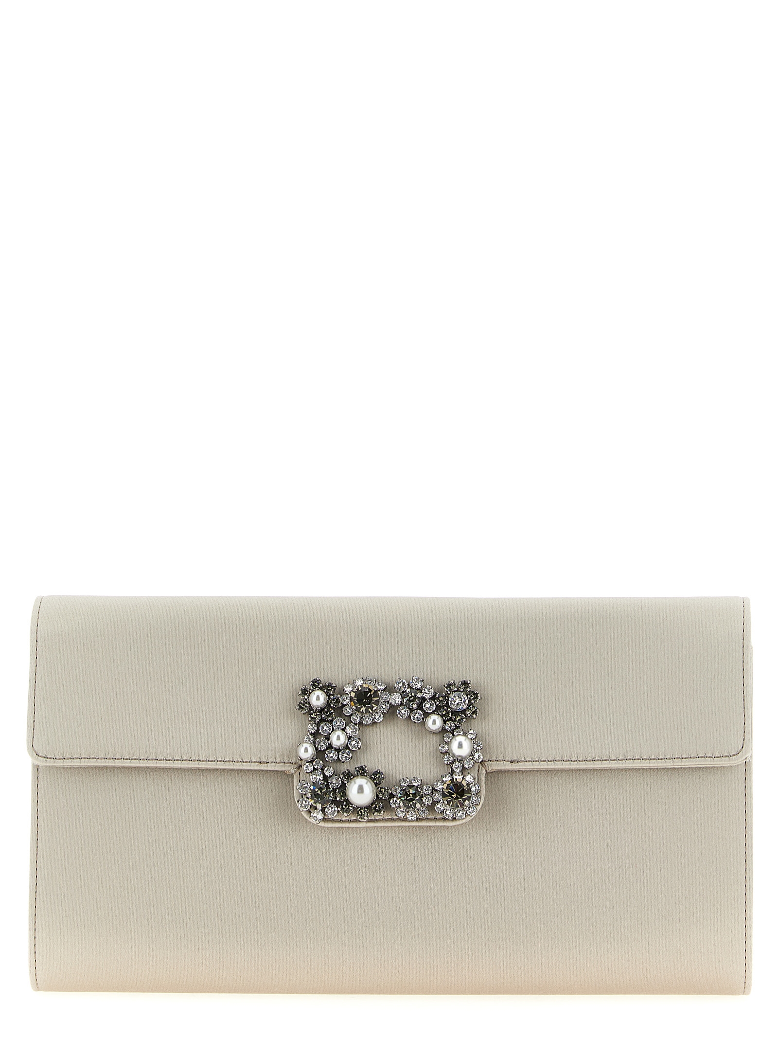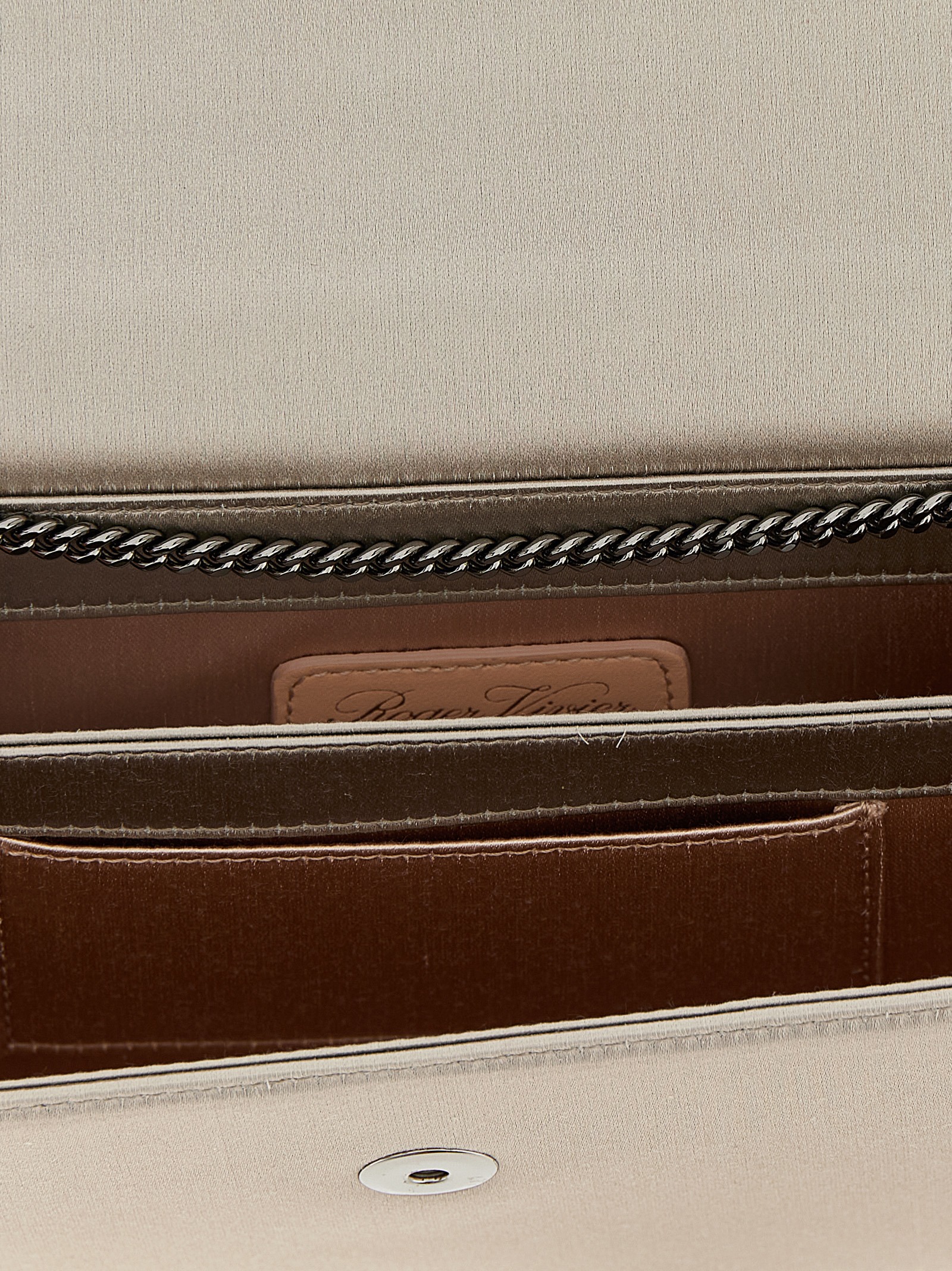 ‘Efflorescence’ clutch bag in satin and silk blend, magnetic flap closure with front jewel detail, sliding chain shoulder strap.