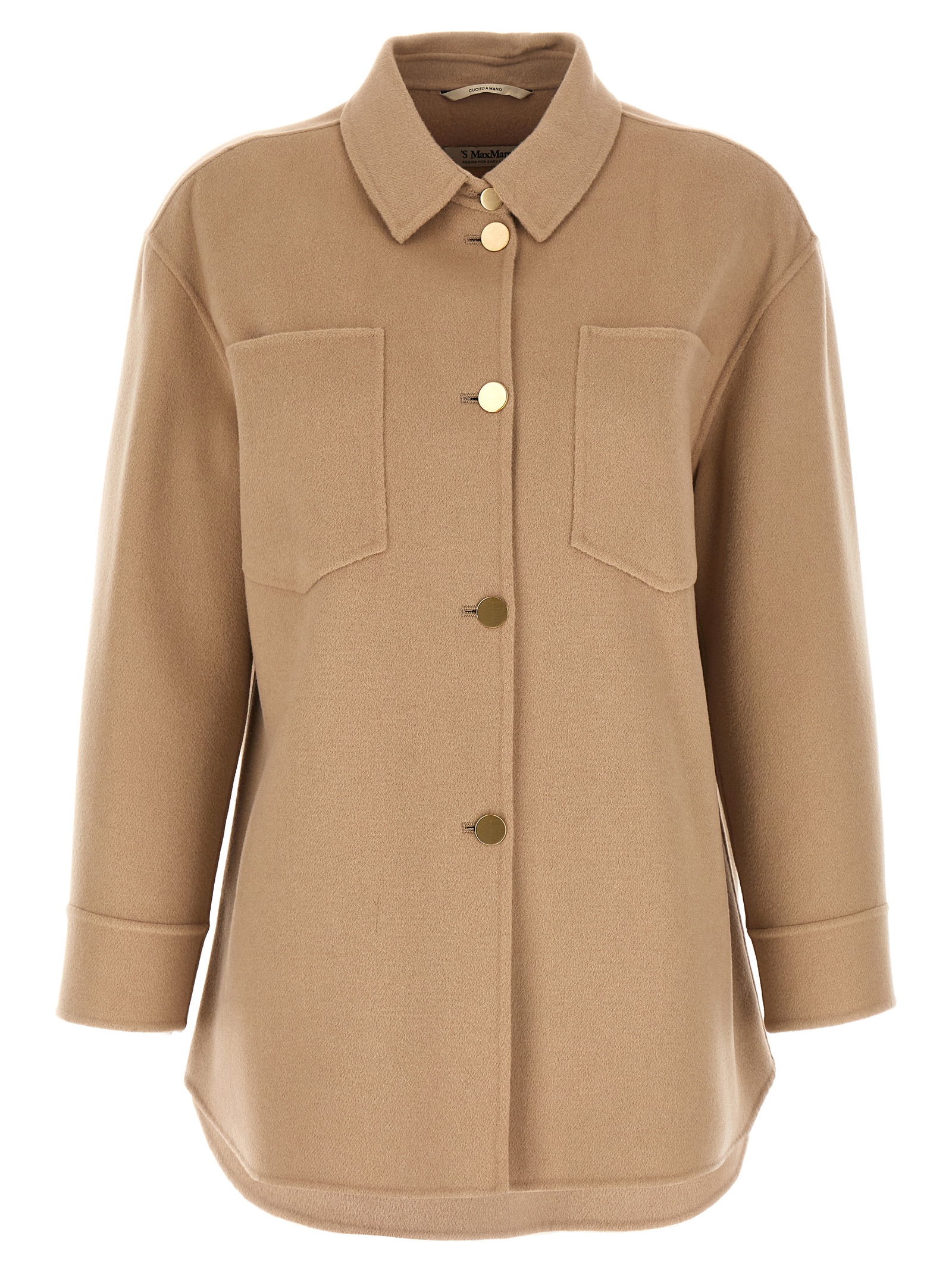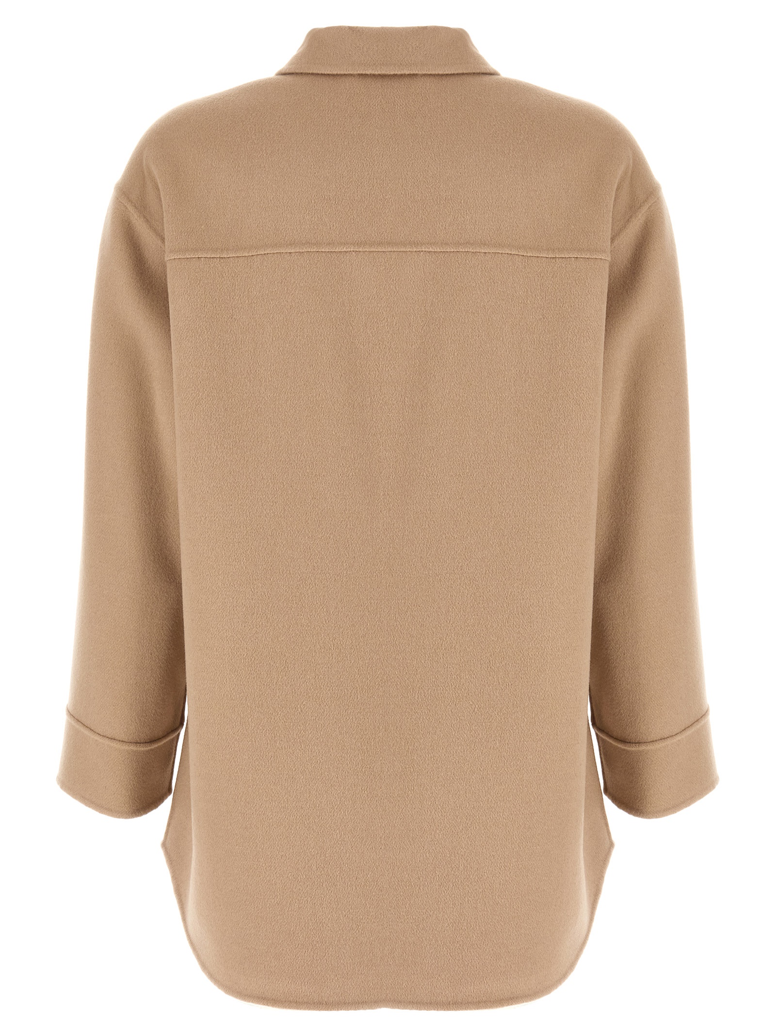 ‘Eleonora’ shirt in double pure wool drap sewn by hand, front metal button closure, pockets, long sleeves with dropped shoulders.