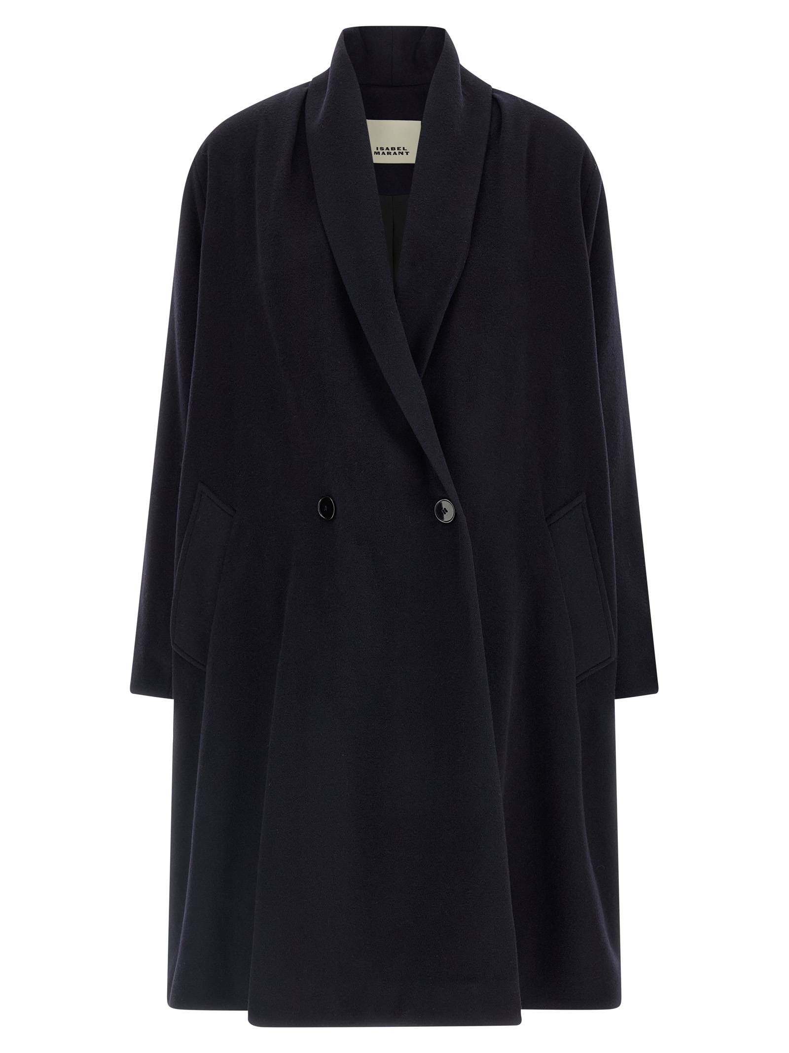 ‘Elise’ double-breasted wool blend long coat with front button closure, shawl collar, pockets, long sleeves with dropped shoulders, monogram twill lining.