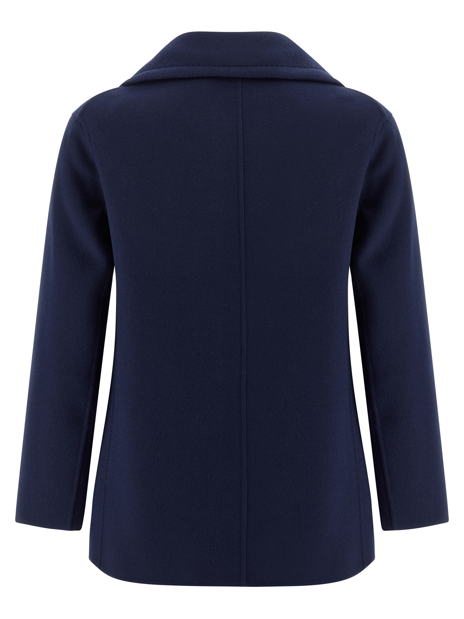 ‘Elise’ double hand-stitched pure wool drap coat, double-breasted caban style with front button closure, slightly flared line, pockets, long sleeves, silk half lining.