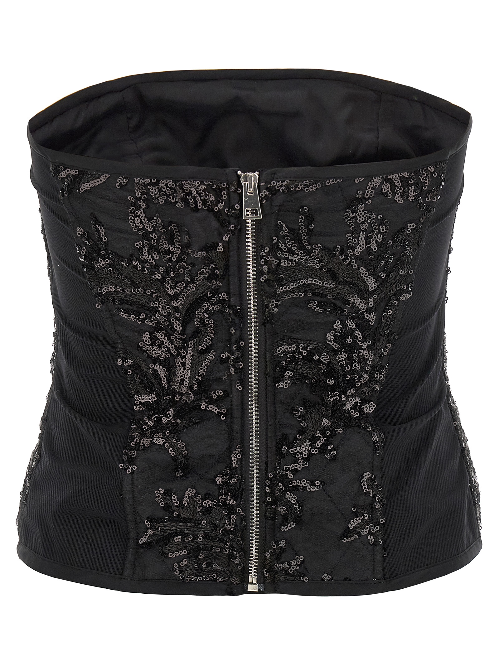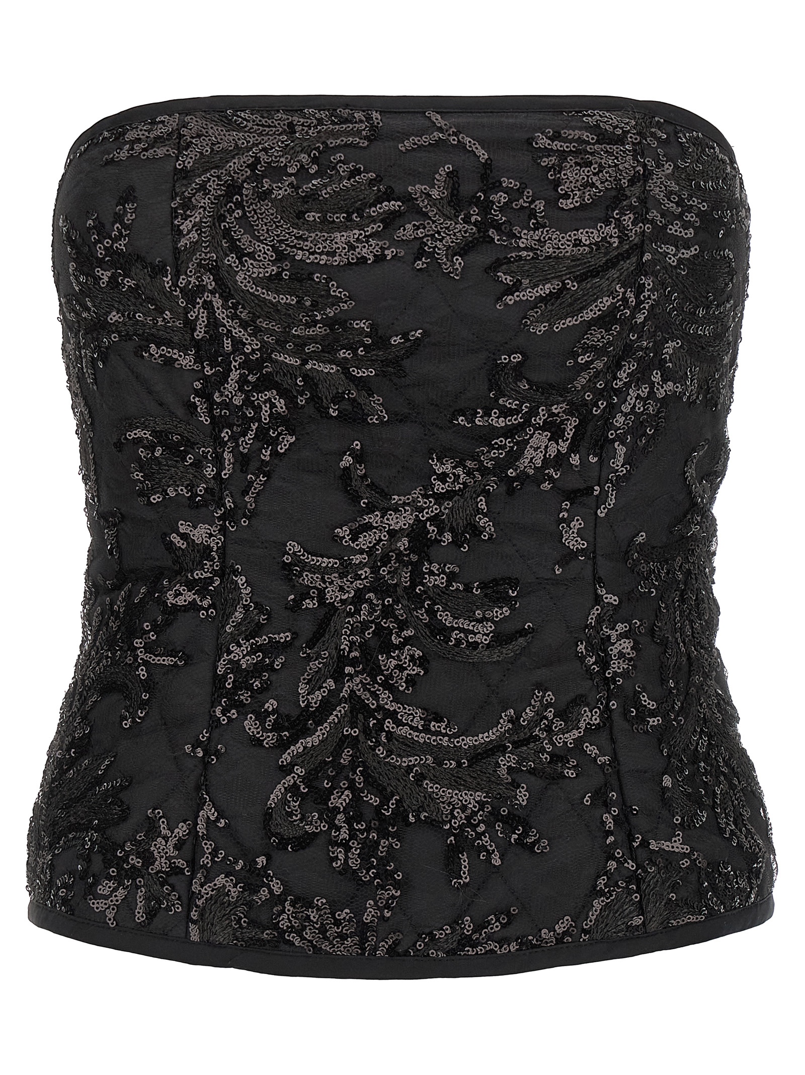 Elodie’ top in quilted fabric covered in lace with sequin appliqué, off-the-shoulder bandeau model, and back zip closure.